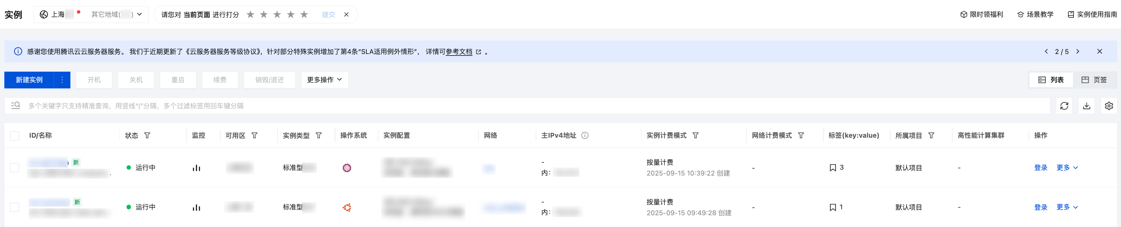 查看某地域下所有实例:在控制台 云服务器 页查看某个地域下所有云服务器实例的信息。