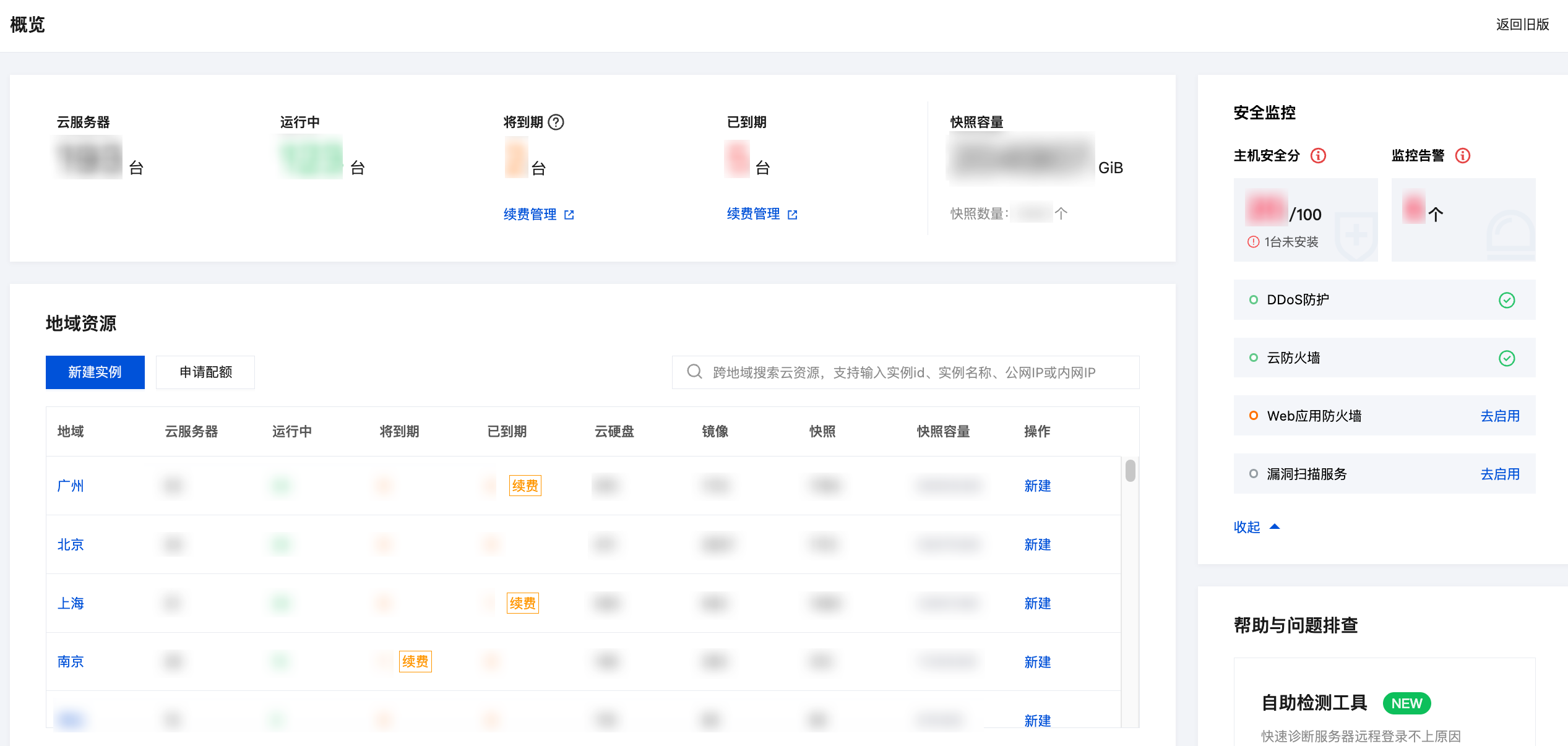 不同地域的云服务器总数,及运行中、将到期(7 天内)、已到期的云服务器数量。