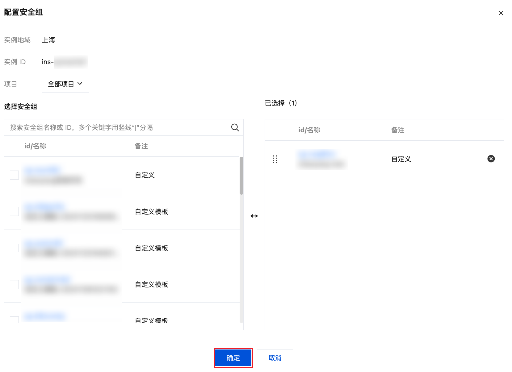 3. 在弹出的配置安全组窗口中,勾选新的安全组名称(可多选),单击确认,即可完成更换安全组的操作。