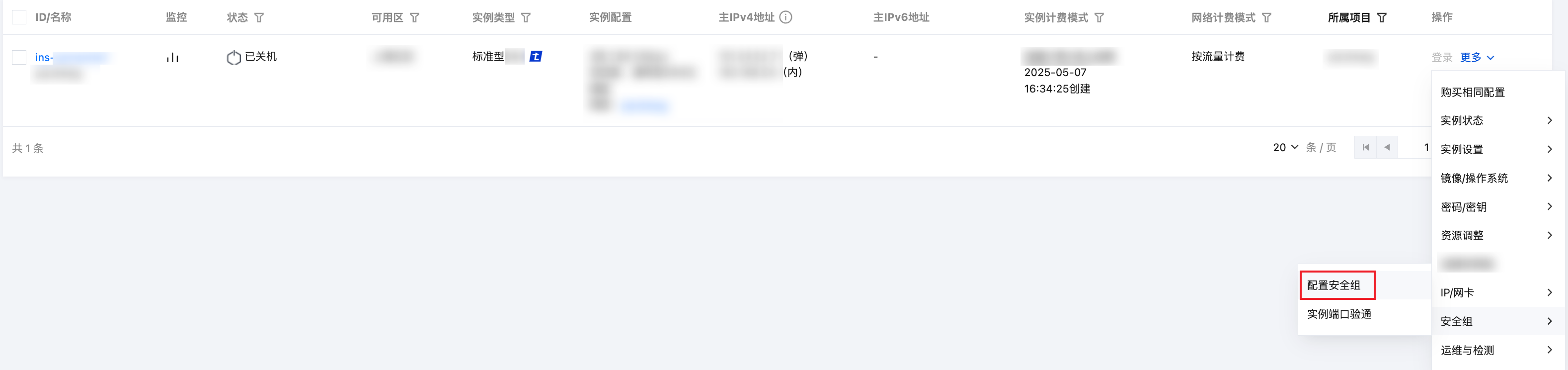 2. 在实例详情页面,选择右上方的更多操作 > 安全组 > 配置安全组。如下图所示: