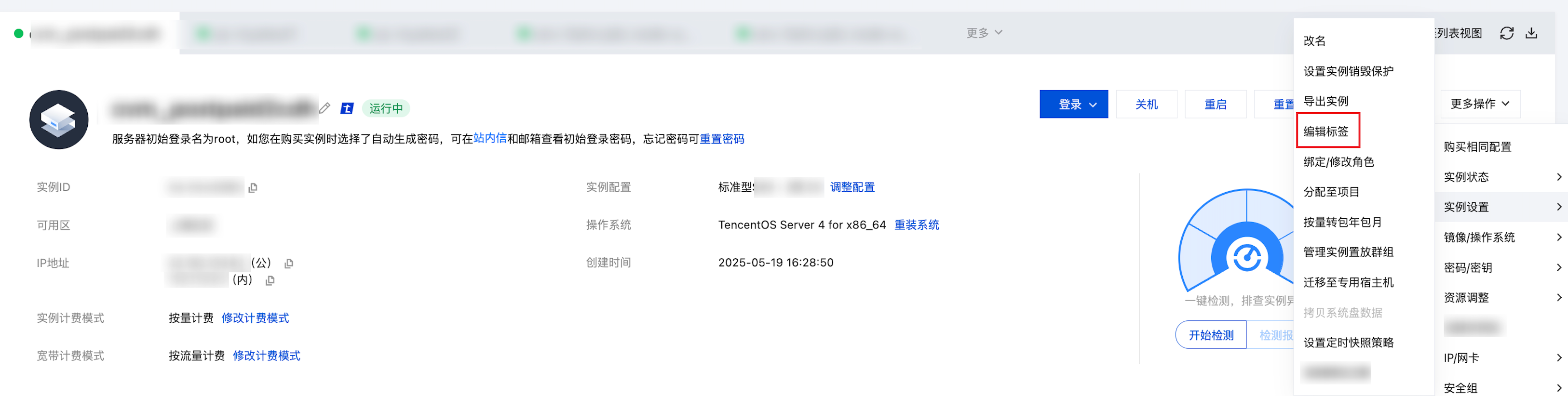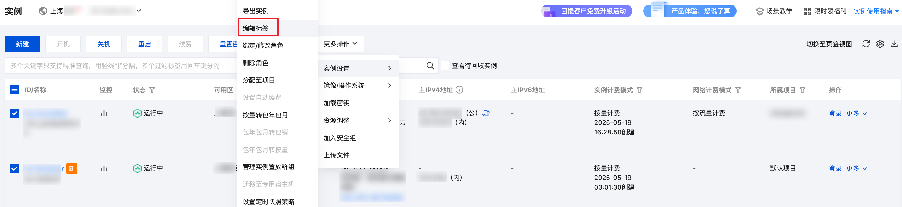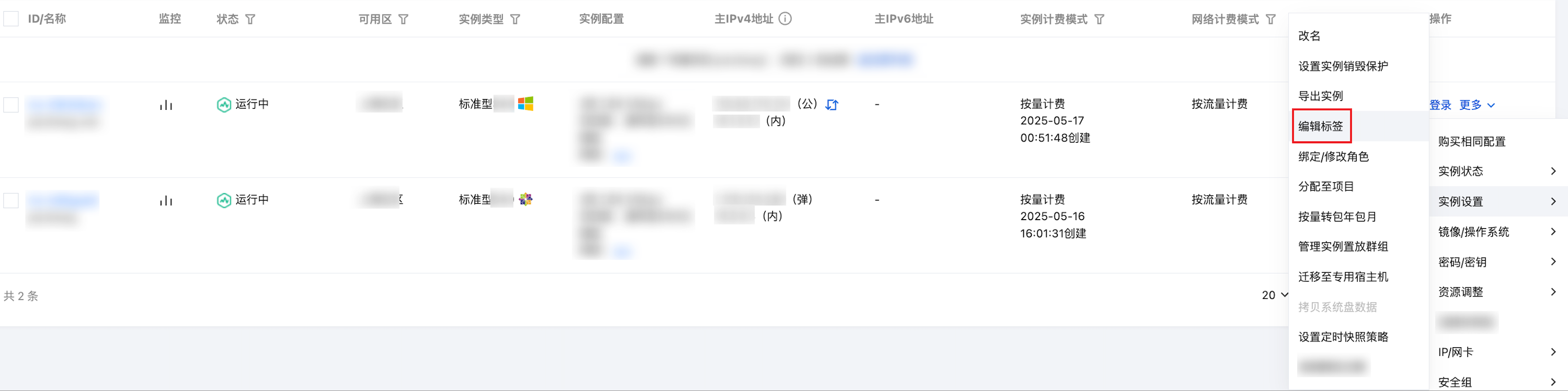 列表视图:选择需要编辑标签的实例,选择更多 > 实例设置 > 编辑标签。如下图所示: