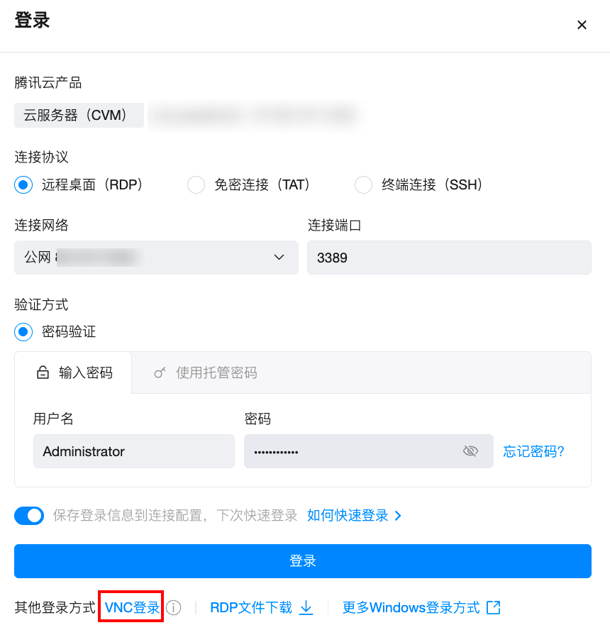 2. 在打开的登录窗口中,选择 VNC 登录。如下图所示: