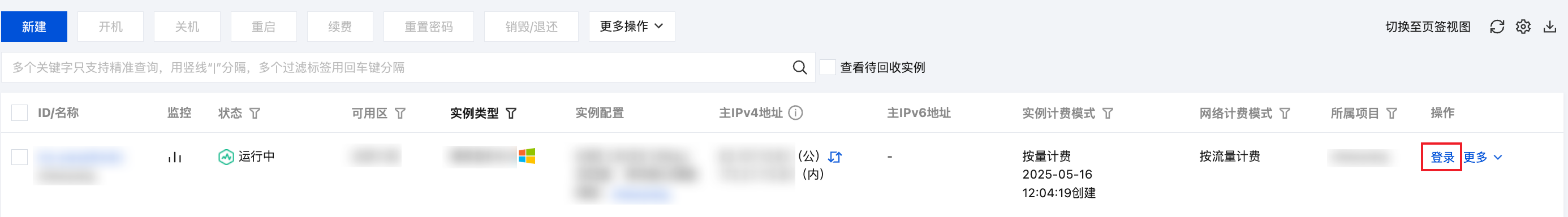 1. 找到需要登录的 Windows 云服务器,单击右侧的登录。如下图所示: