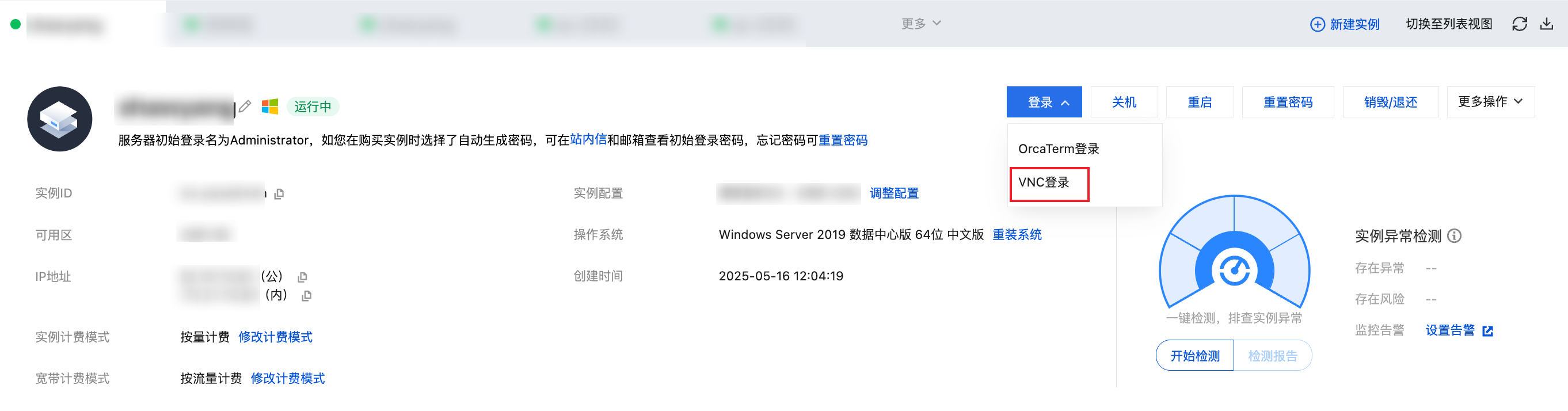 选择需要登录的 Windows 云服务器页签,选择登录 > VNC 登录。如下图所示: