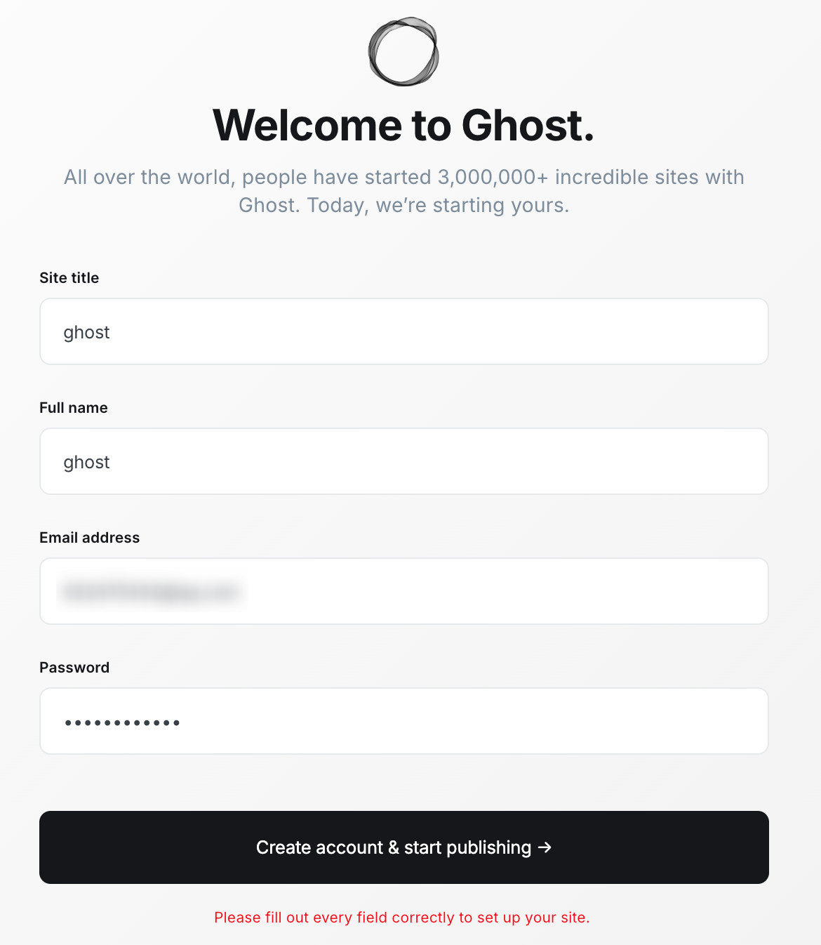 4. 使用本地浏览器访问 Ghost 的管理员访问地址,开始个人博客配置。如下图所示: