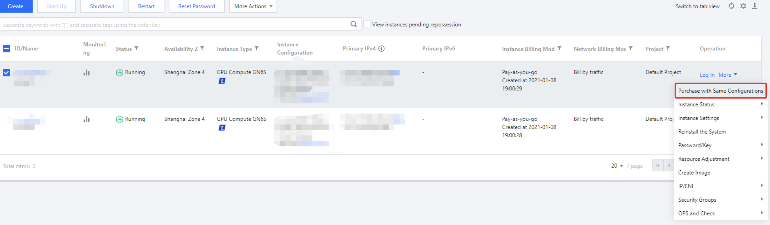 Locate the instance you want to operate on, and click More > Purchase with same Configurations in the Operation column, as shown below: