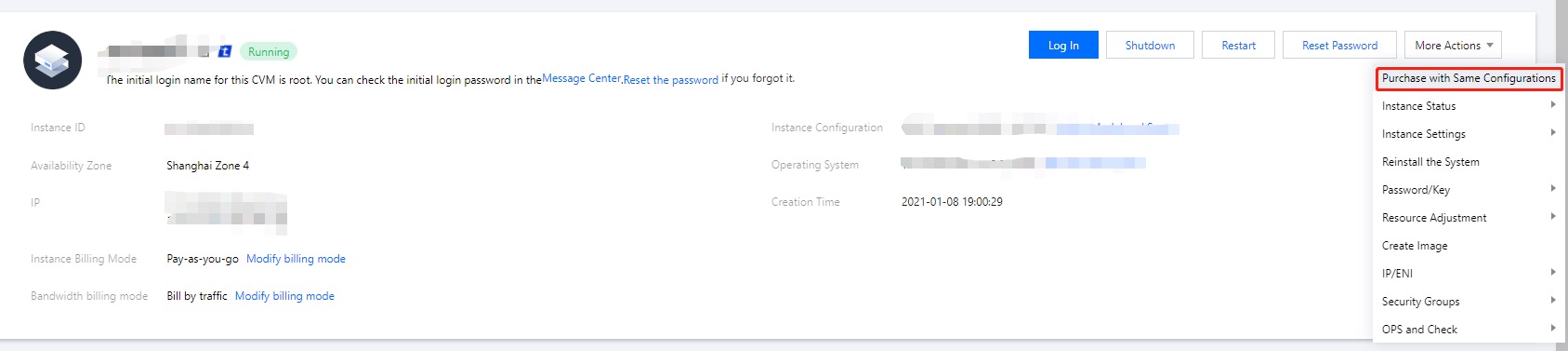 On the desired instance page, click More > Purchase with same Configurations in the upper right corner, as shown below:
