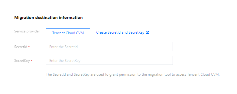 The current source service provider has been set to Tencent Cloud CVM by default. You need to enter the Tencent Cloud API key's SecretId and SecretKey (How to Obtain)to obtain the necessary permissions for Tencent Cloud CVM. You can directly copy the key information from the API Key Management page. Please verify that the API key is correct, as incorrect keys may result in migration failure.