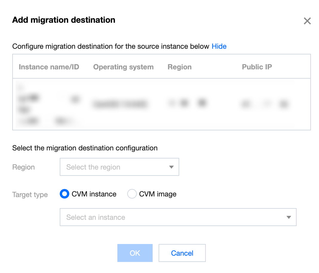 CVM Instance: Select a CVM instance in the target region as the migration destination. Target Instance: It is recommended that the target CVM's operating system is as close as possible to the source server's operating system type. For example, when migrating a CentOS 7 system source server, choose a CentOS 7 CVM as the migration target. Additionally, the target CVM's system disk and data disk capacities should both be larger than the source server's.