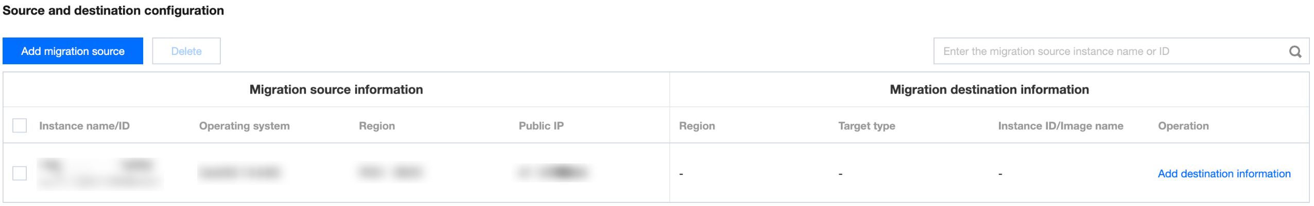 4.4 After clicking OK, the instance information to be migrated will be displayed in the Migration Source Information list. You can click Add deetination Information in the operation column to configure the migration target information.
