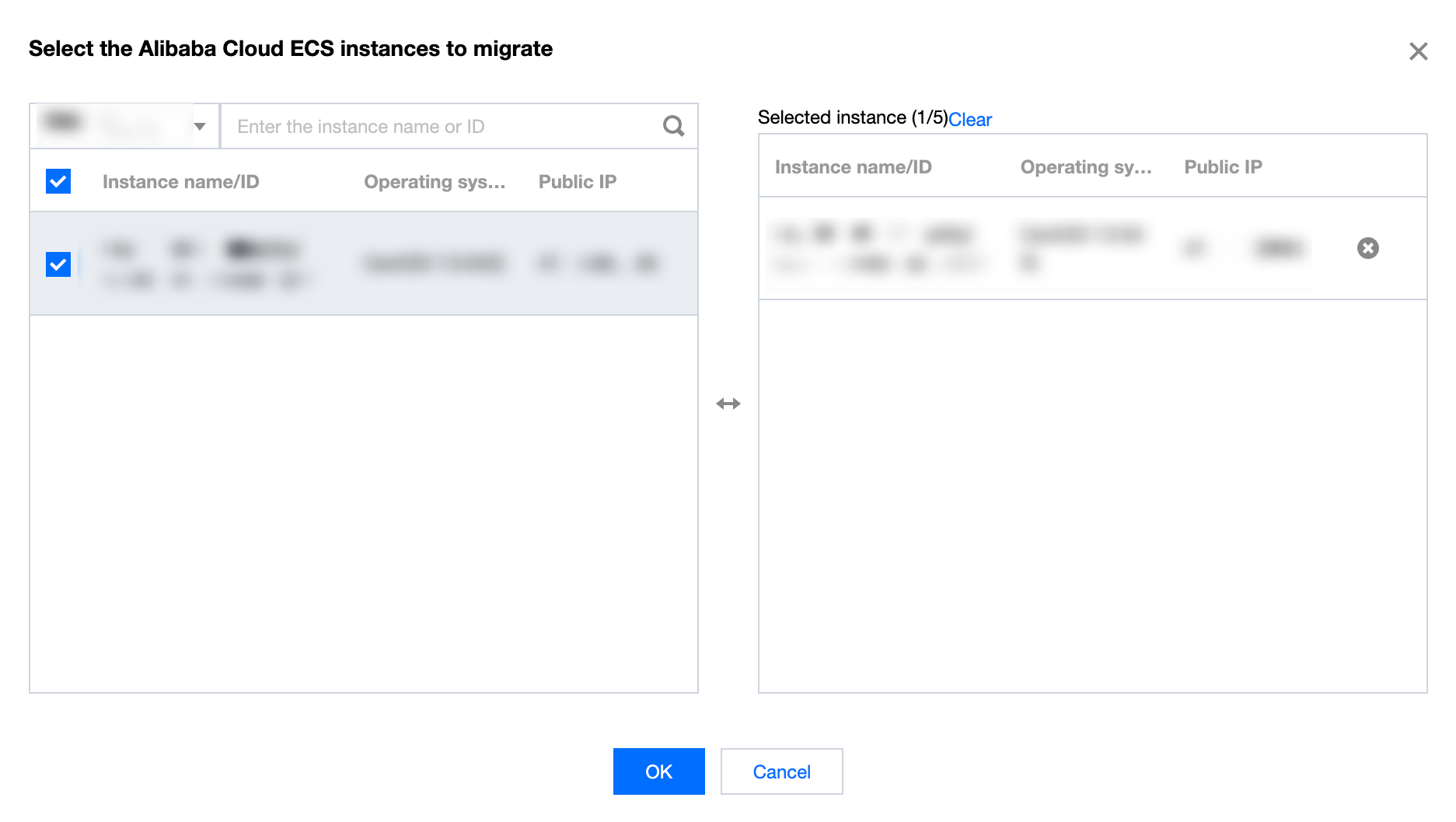 4.3 Select the instances you want to migrate to add them to the Selected instance list on the right.
