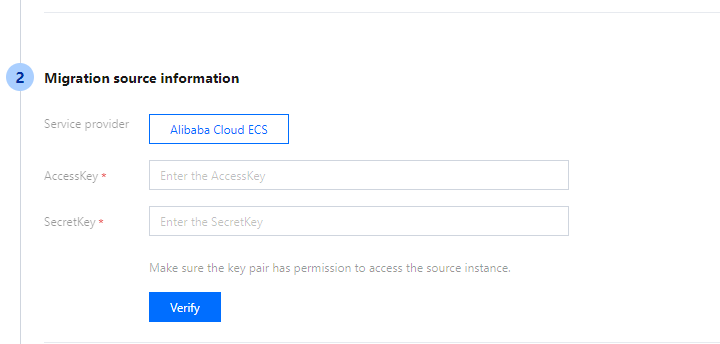 The current source service provider is set to Alibaba Cloud ECS by default. You need to enter the AccessKey and SecretKey of your Alibaba Cloud account (How to obtain) and verify to ensure access to the source server information, as shown in the figure: