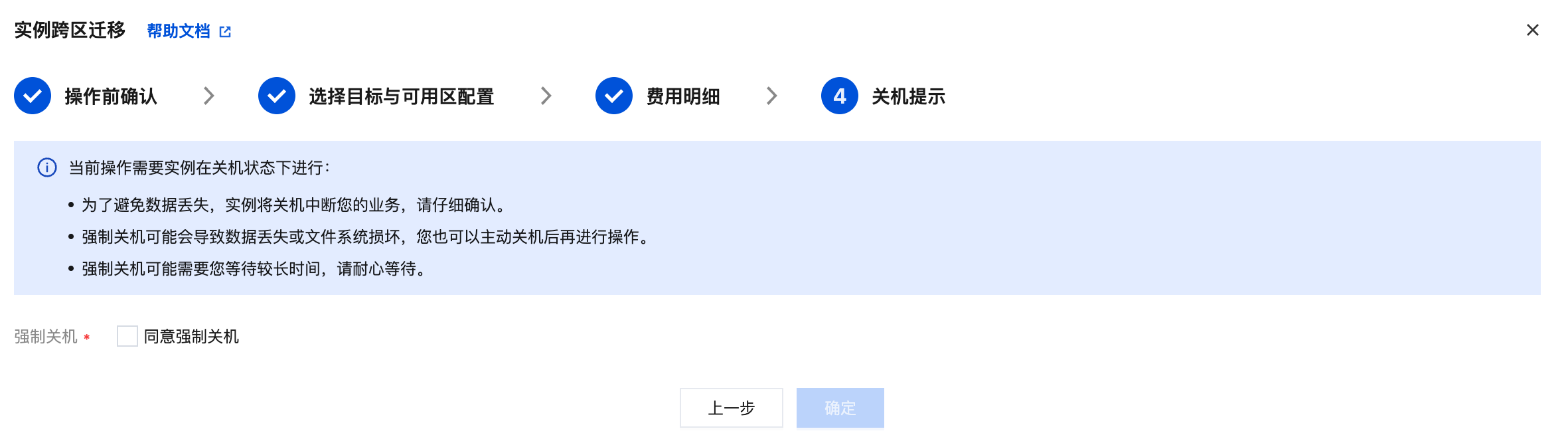 6. 实例在运行状态时,需要关机后才能迁移,可勾选强制关机,因强制关机可能会导致数据丢失或文件系统损坏,建议主动关机后再发起迁移。
