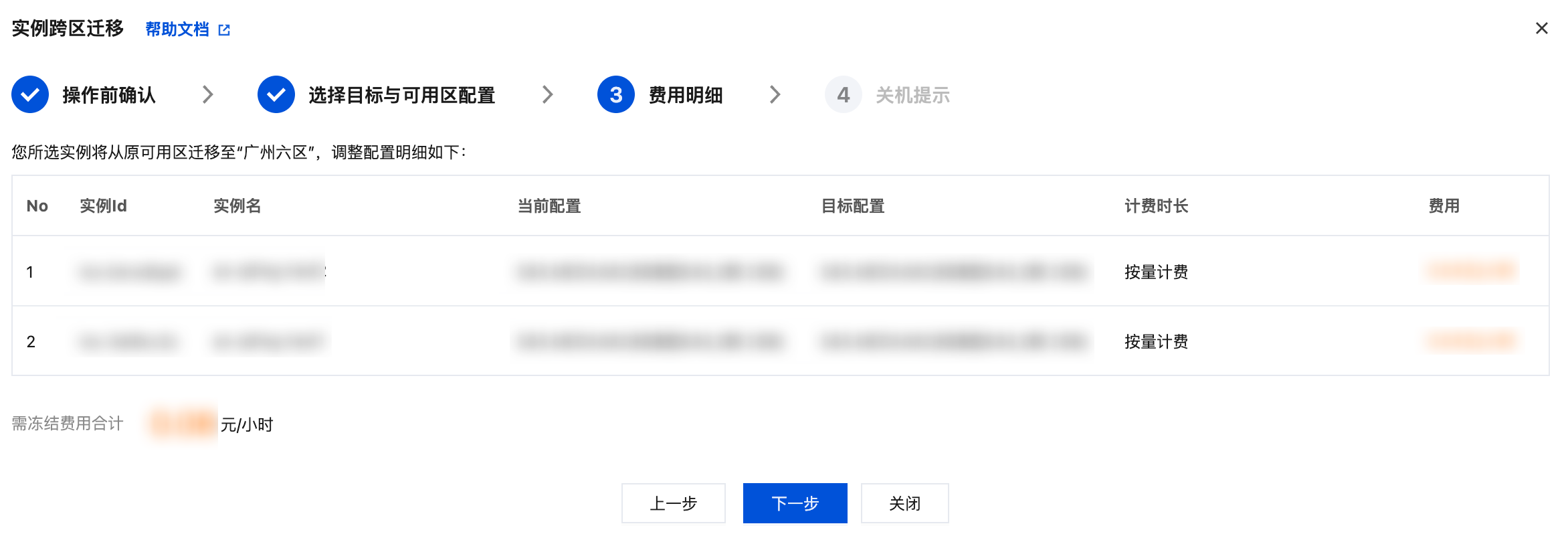5. 迁移到其他可用区,可能会涉及到价格变更,如相同规格的实例在不同可用区可能价格不同,或者用户在迁移时升级/降低配置导致费用不同,确认后单击下一步。