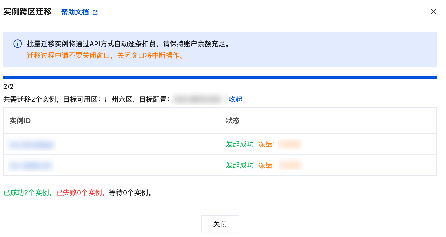 7. 发起迁移,可查看迁移进度,迁移完成后,关闭窗口。