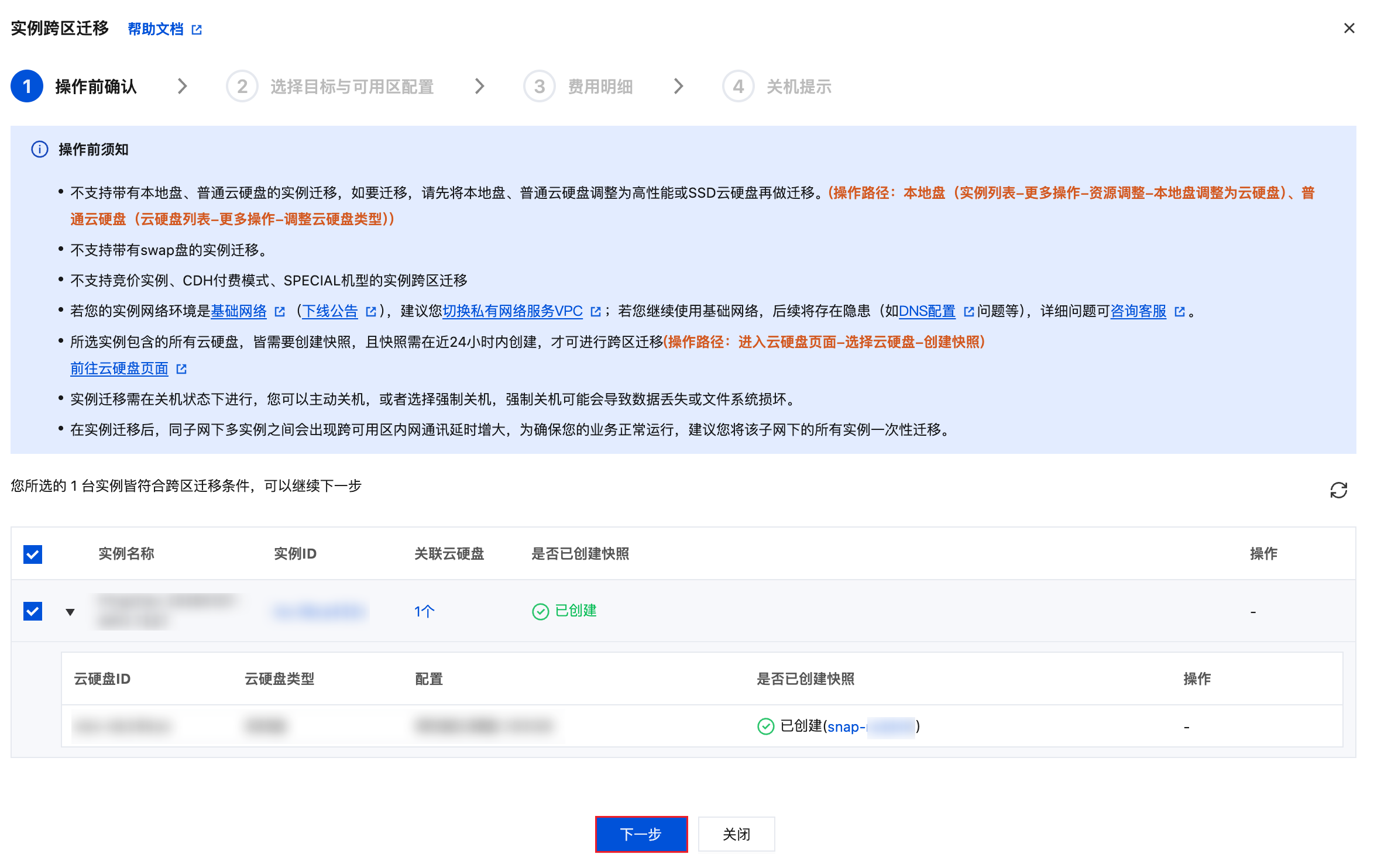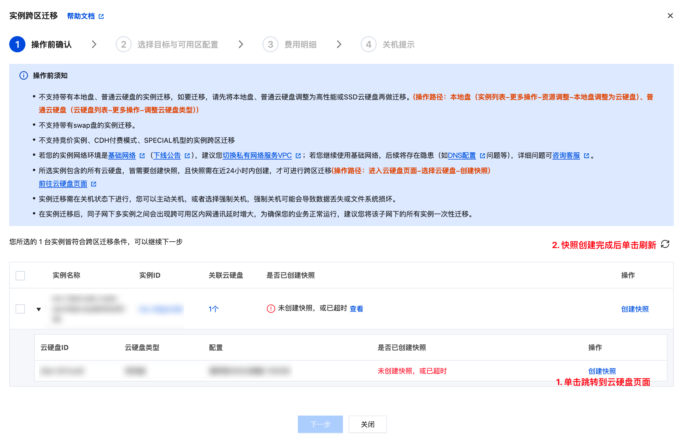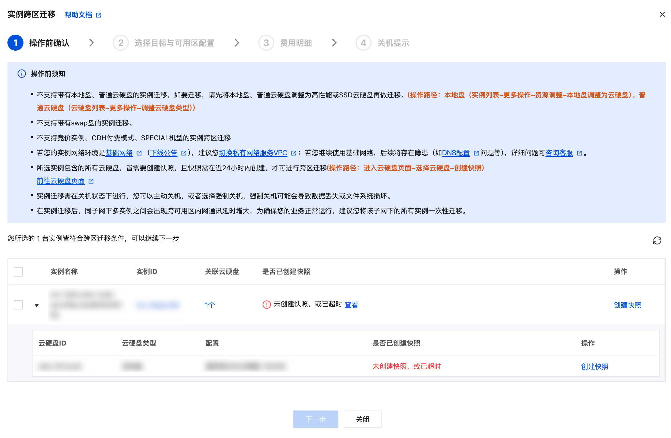 2. 根据提示,做好迁移前的准备。如提前创建好快照:因跨区迁移是以回滚快照的方式迁移硬盘中的数据,在迁移前,需提前做好全量快照,为确保迁移后的实例为最新状态的实例,建议快照在24小时内创建。