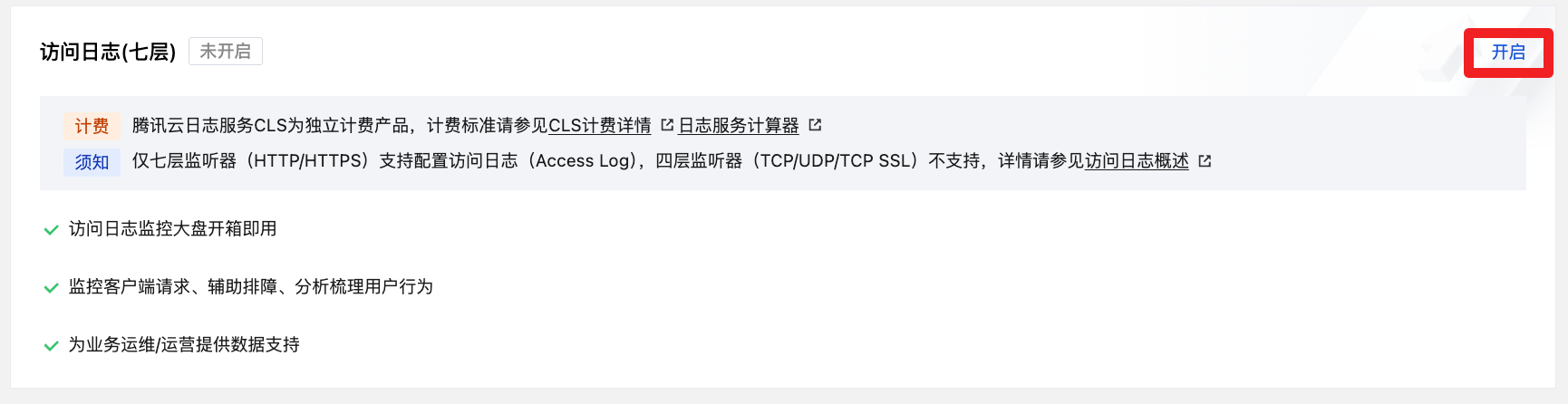 3. 在基本信息页面的访问日志(七层)模块,单击开启。