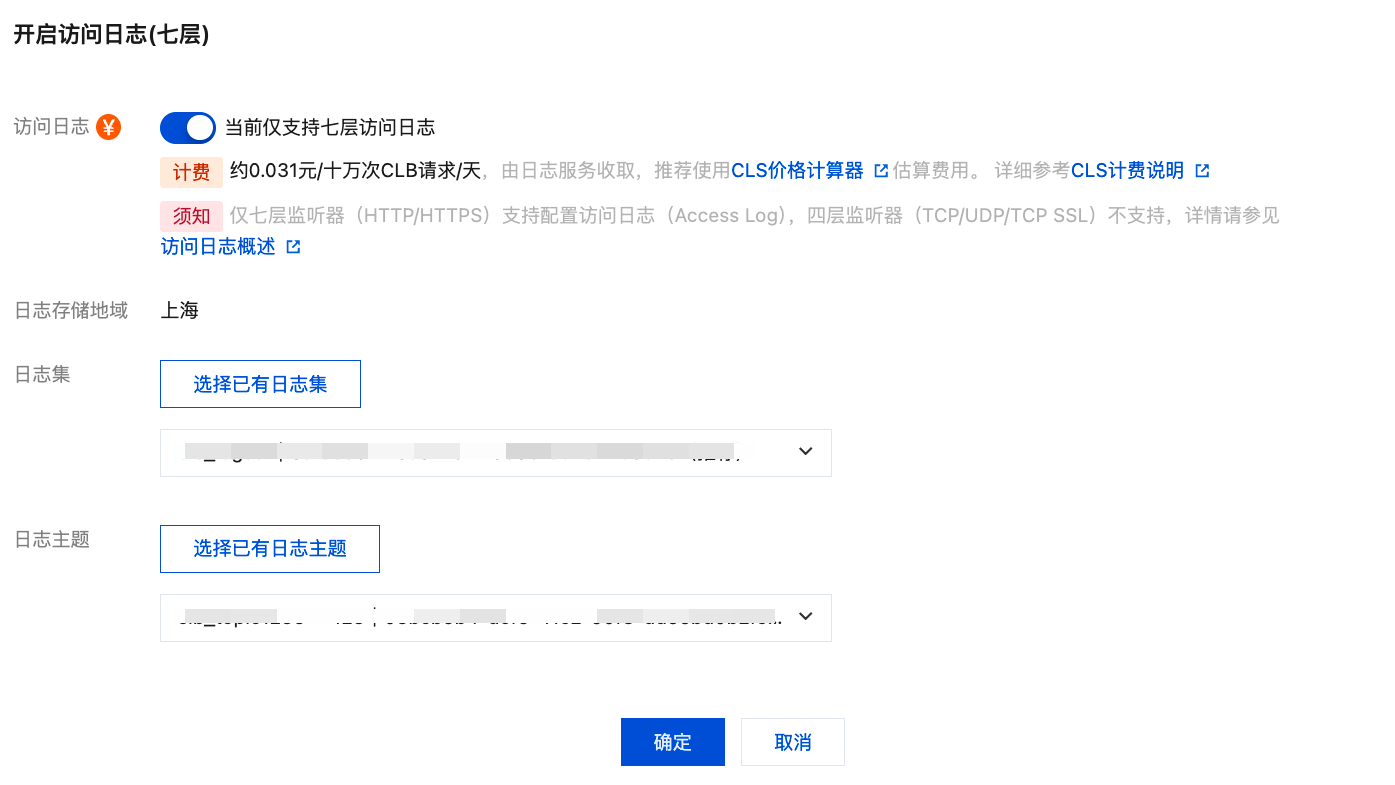 4. 在弹出的开启访问日志(七层)对话框中,开启访问日志,并选择存储访问日志的日志集和日志主题,单击确定。若您没有创建日志集或日志主题,请 新建相关资源 后,再选取具体的存储位置。