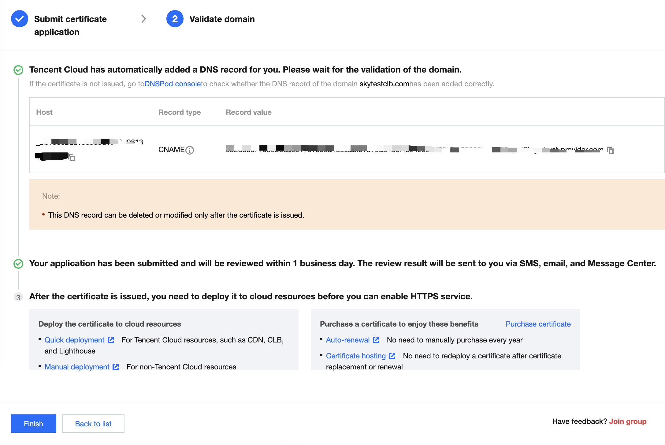 If the domain name applied for is successfully hosted on the DNSPod DNS Console, automatic DNS addition is supported.