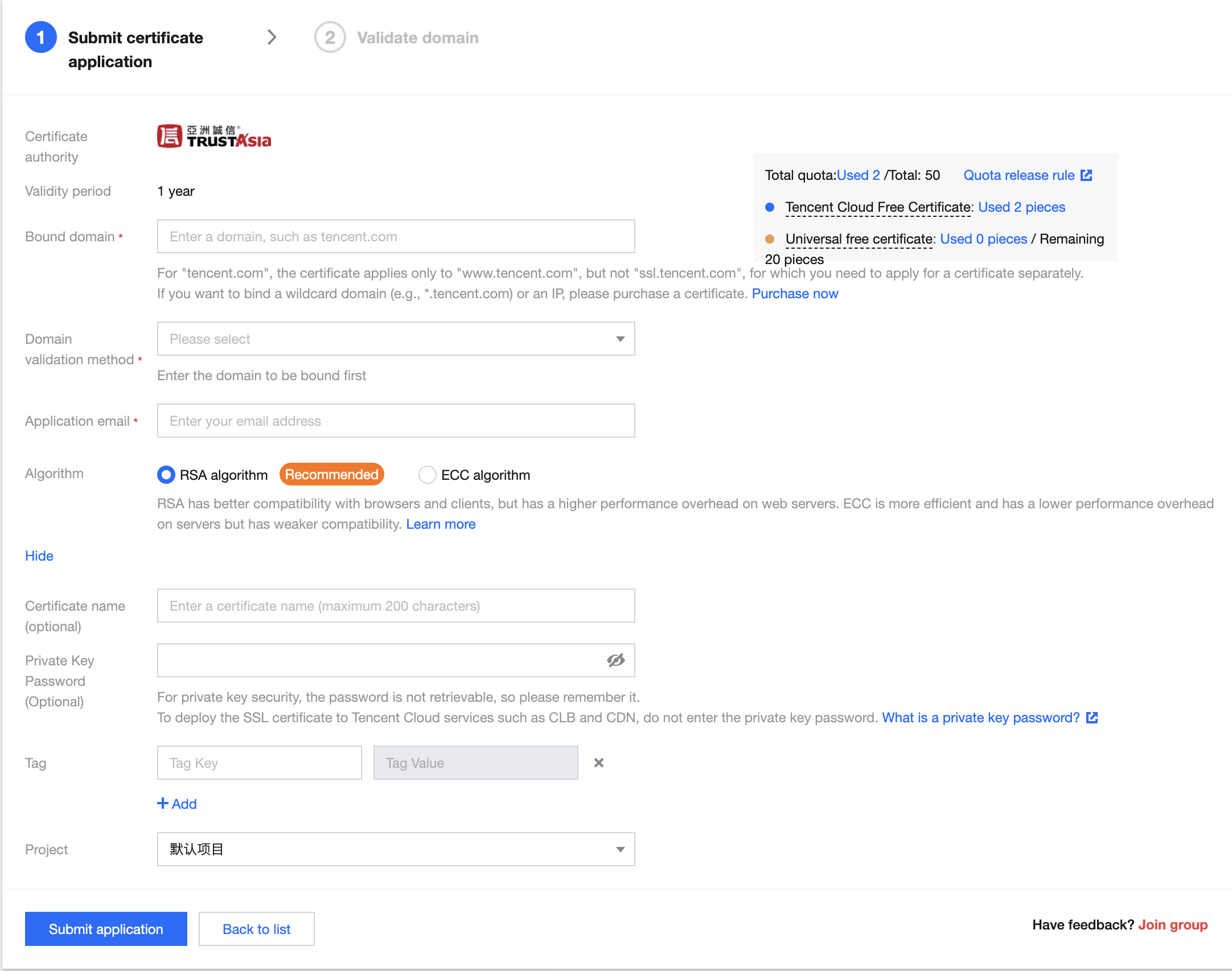 Project: Please select the project to which your certificate belongs, making it convenient for you to manage your certificates through the project.