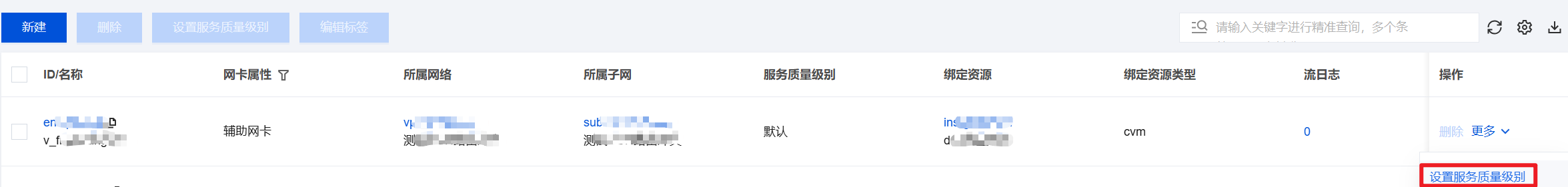 3. 找到需要设置服务质量级别的弹性网卡所在行,单击操作列的更多 > 设置服务质量级别。