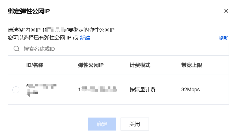 若无可选的弹性公网 IP,可单击弹框上方的新建进行申请,具体操作请参见 申请弹性公网 IP,申请成功后返回弹出框并单击刷新,即可看见申请的弹性公网 IP,选中并单击确定即可。