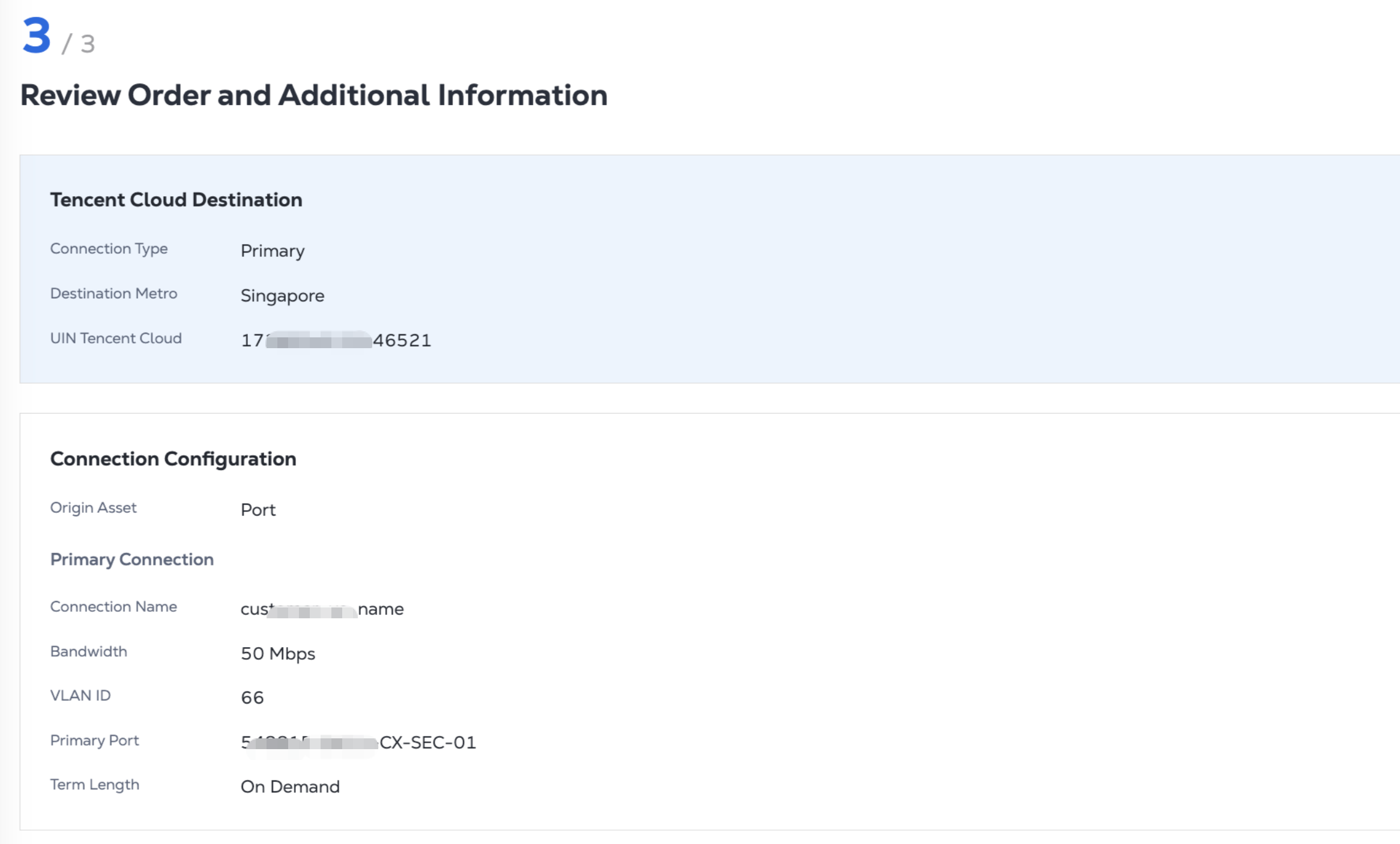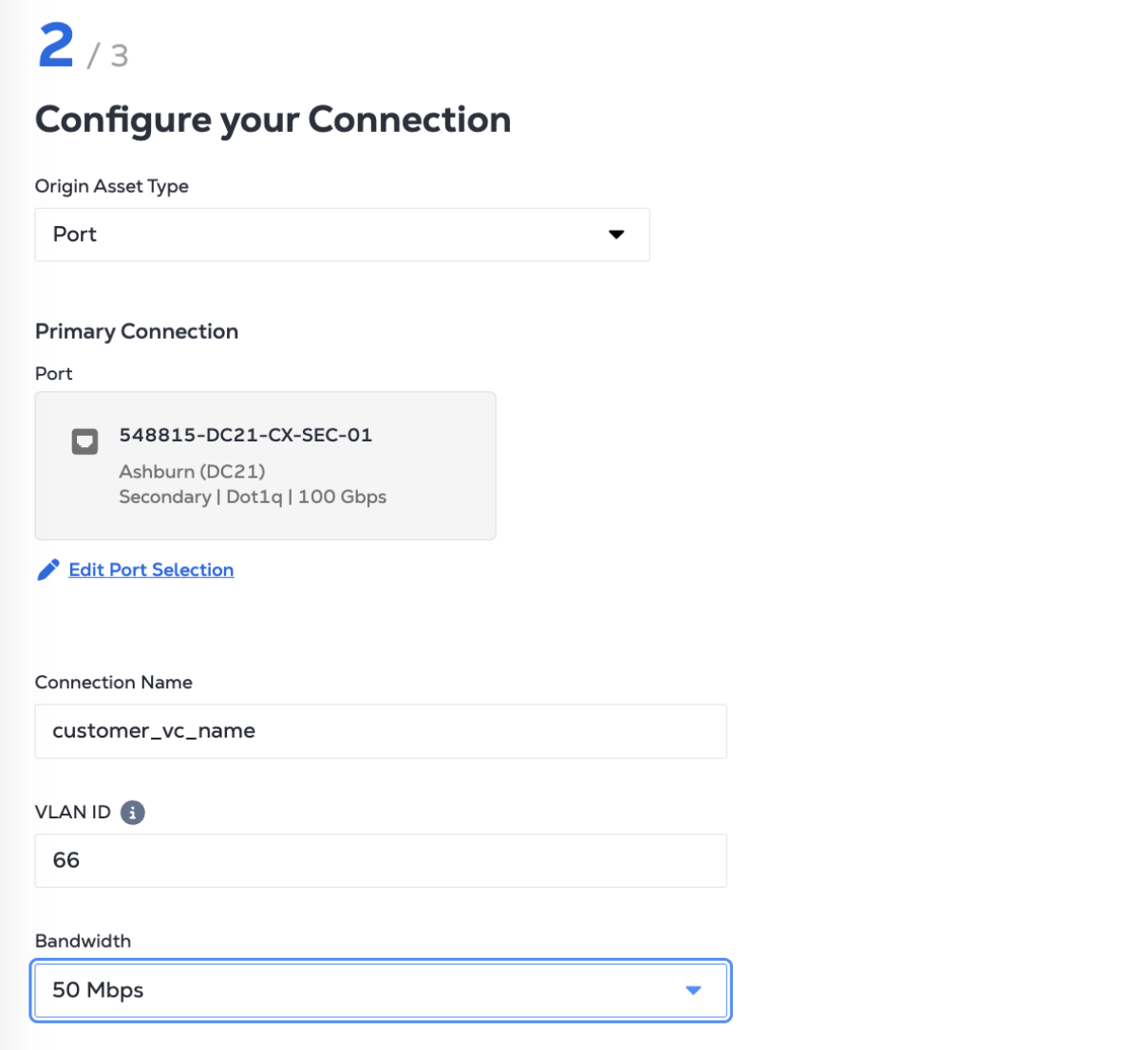 3. 进行 connection 的参数填写:Connection Name 、VLAN ID、带宽等,确认后进入下一步。