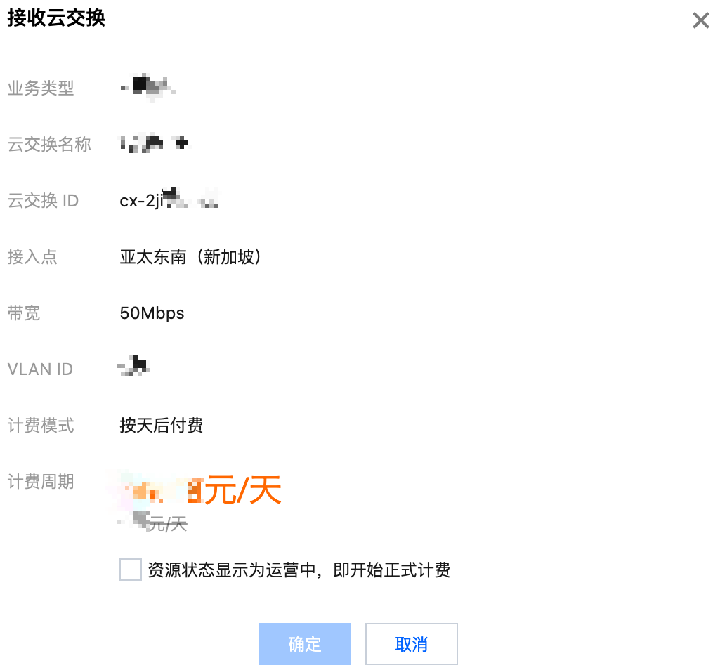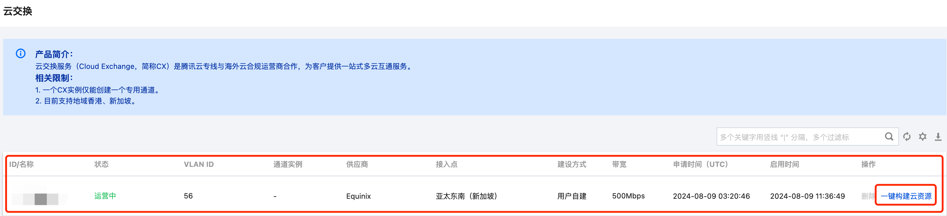 2. 当云交换实例状态为运营中,表示已和 Equinix 连通,可以创建腾讯云资源。您可以在具体实例所在行单击一键构建云资源,并在构建页面依据实际情况配置相应的参数,配置参数详情请参见 独享专用通道。