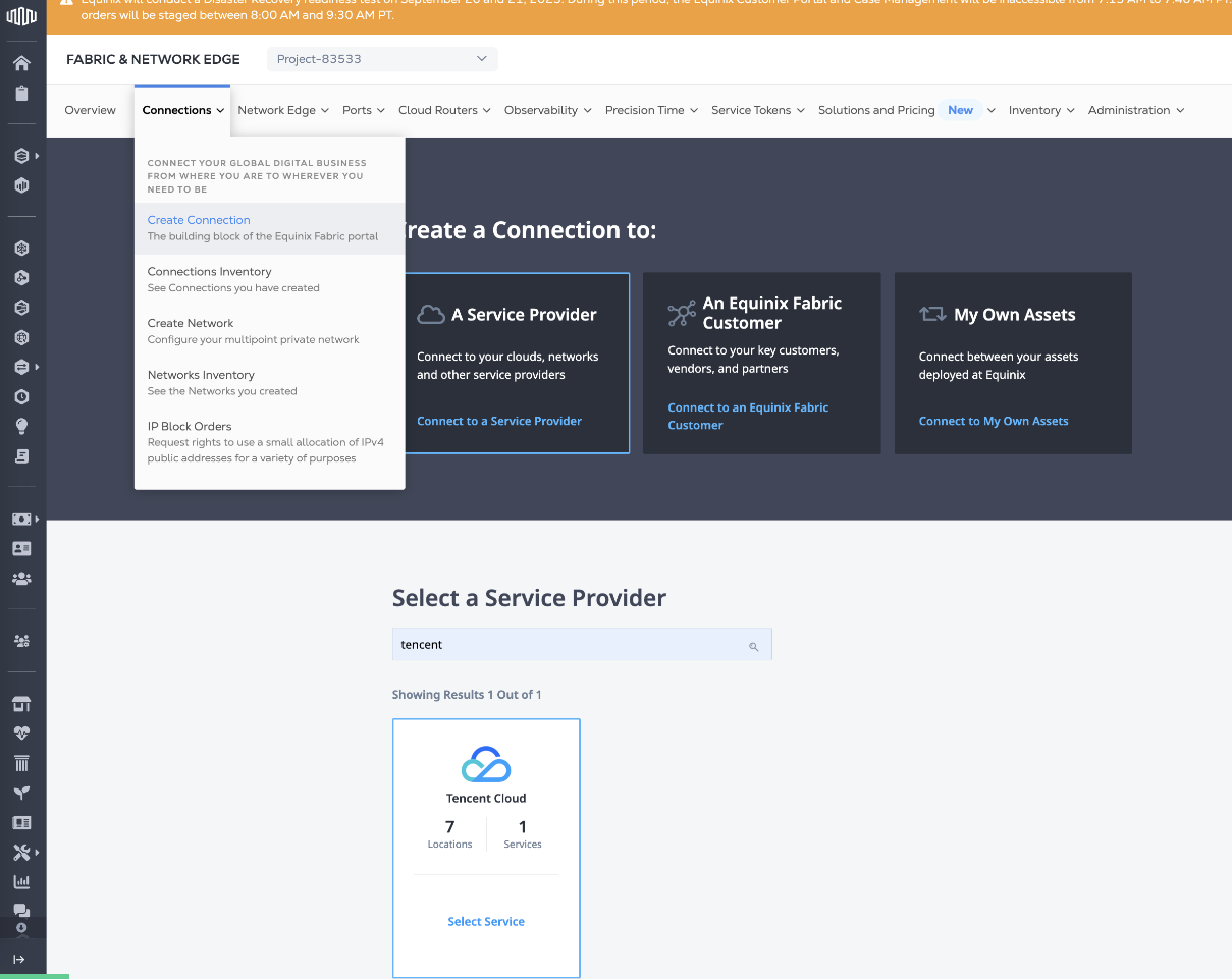 1. 登录 Equinix Fabric。从 Connections 菜单中选择 Create Connection。