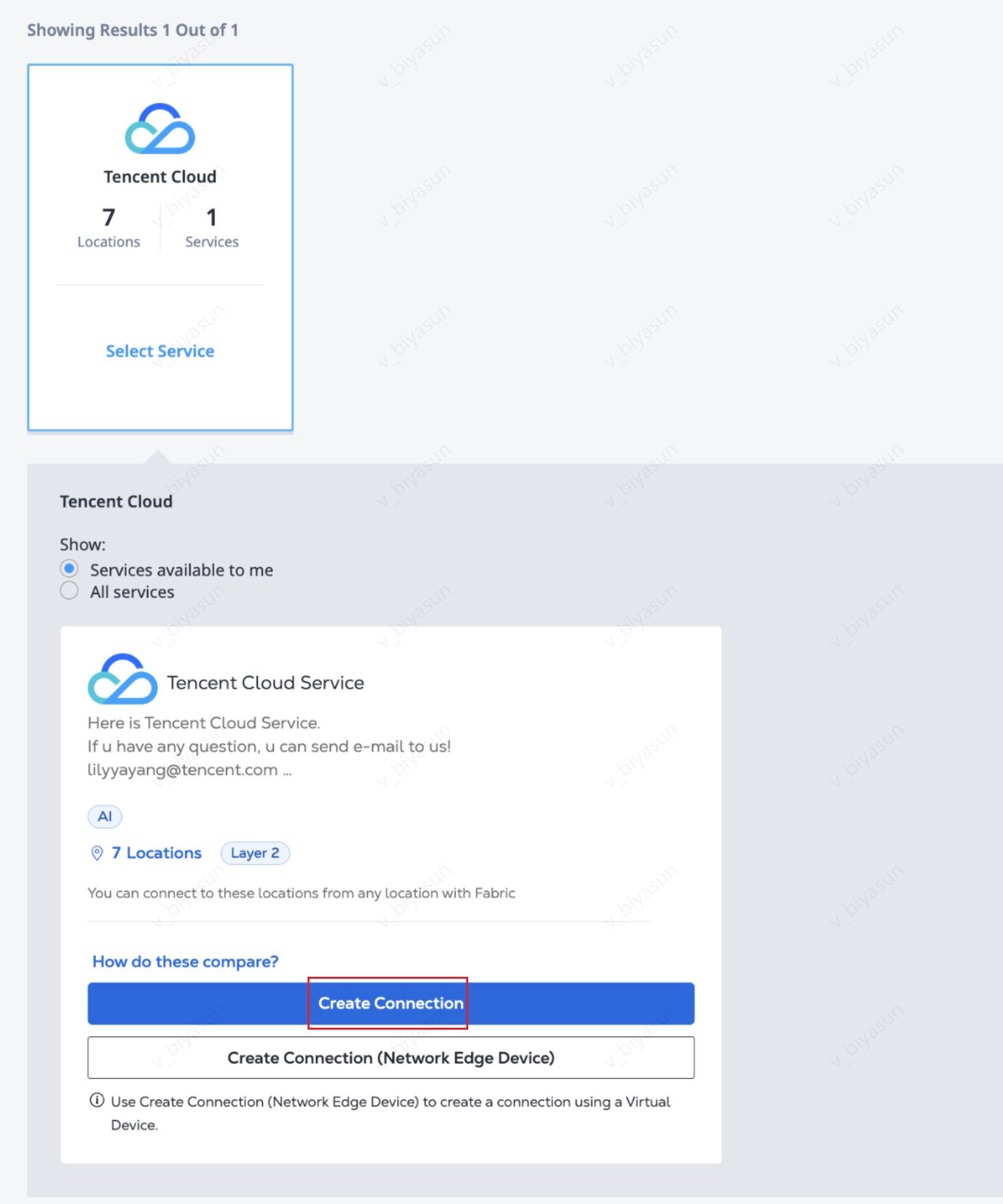 3. 在 Select a Service Provider 区域的搜索框输入 tencent,在弹出的浮窗中选择服务类型 Services available to me,并单击 Create Connection。