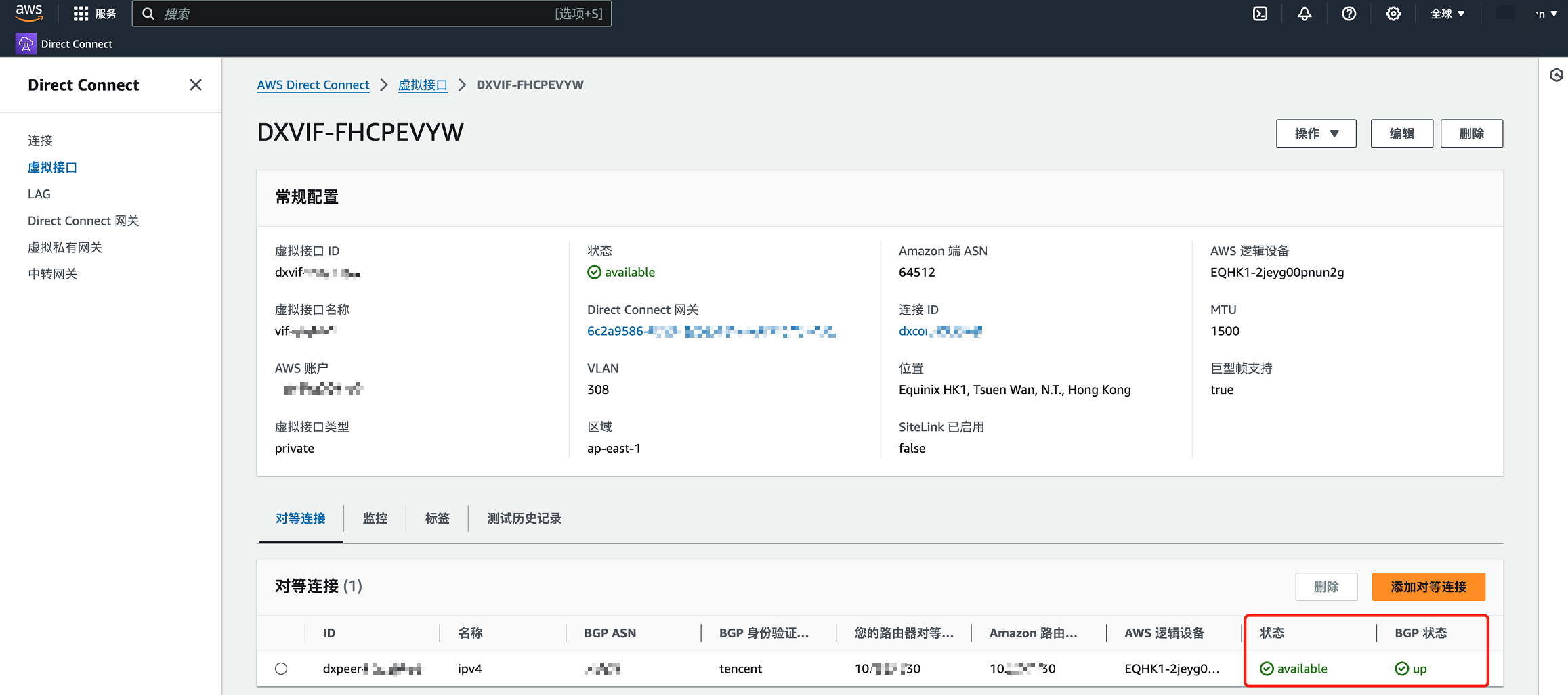 2. 查看并确认虚拟接口 available,BGP 状态 up。