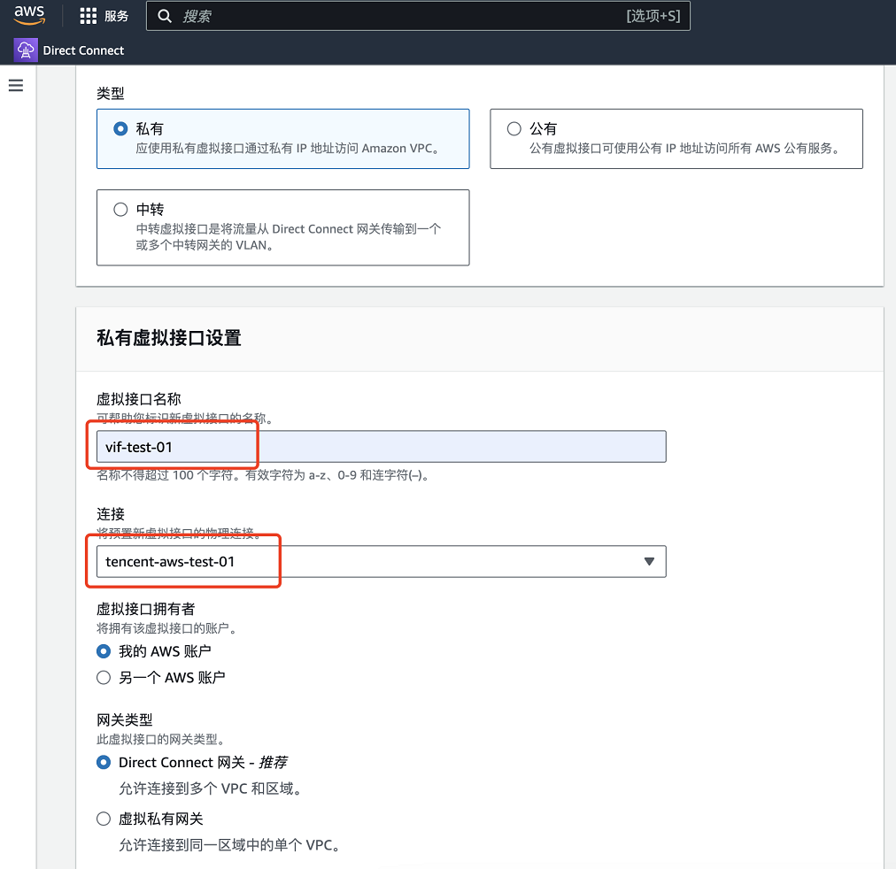 此示例中 AWS 控制台填入的对等体 IP、BGP ASN、BGP 密钥均需与腾讯云控制台填入的配置匹配,否则虚拟接口无法连接。