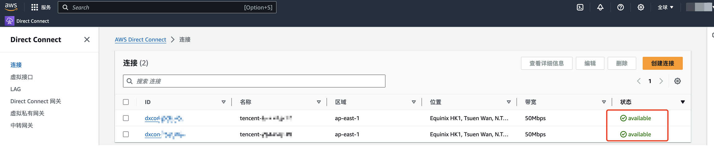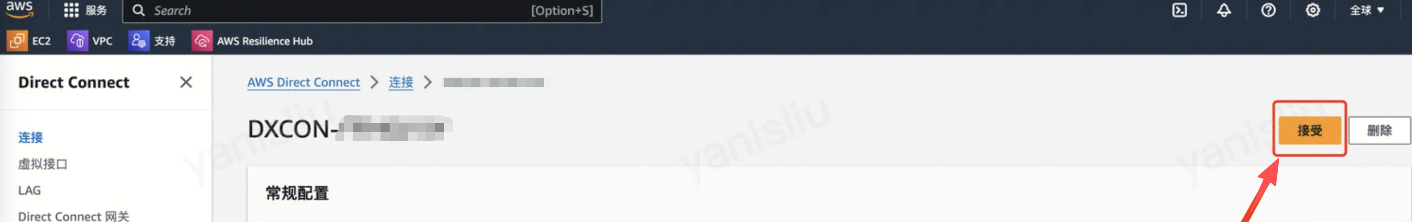 1. 登录 AWS 云的 Direct Connect 控制台,在左侧导航单击连接,进入连接列表页。找到待接收的连接 ID,查看连接详情。单击右侧 Accept,同意订购连接。