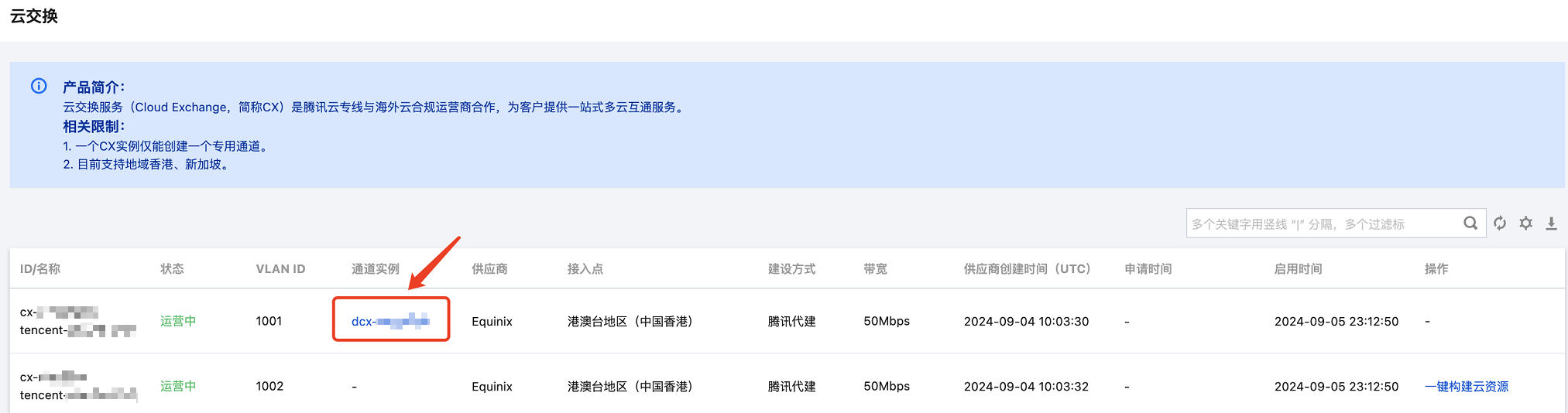 3. 在云交换实例页面,单击通道实例 ID。