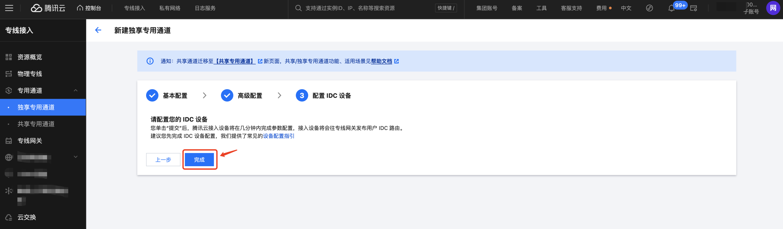 6. 单击完成,完成独享专用通道配置。