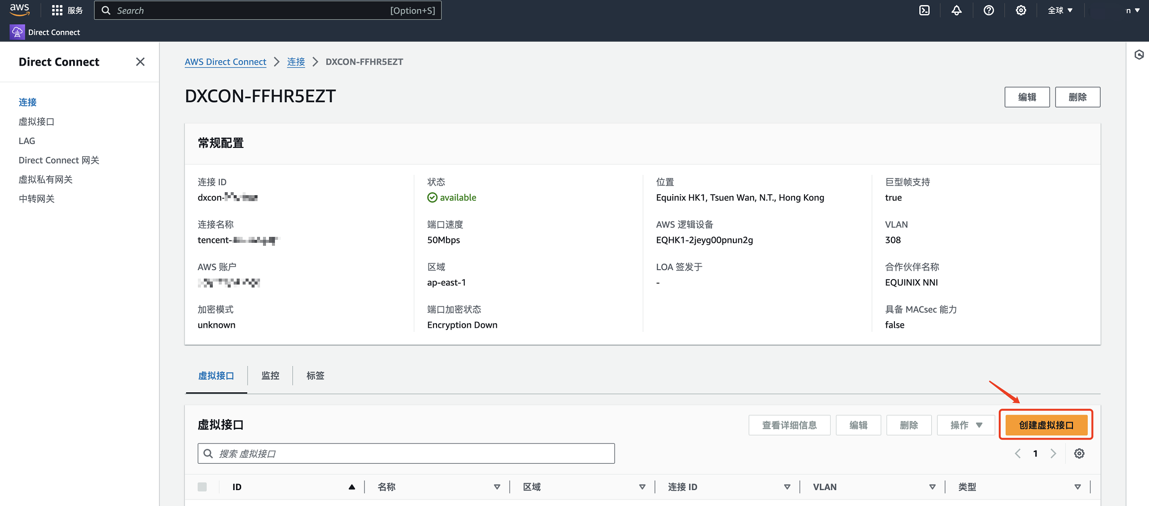 1. 在连接详情页,单击创建虚拟接口。