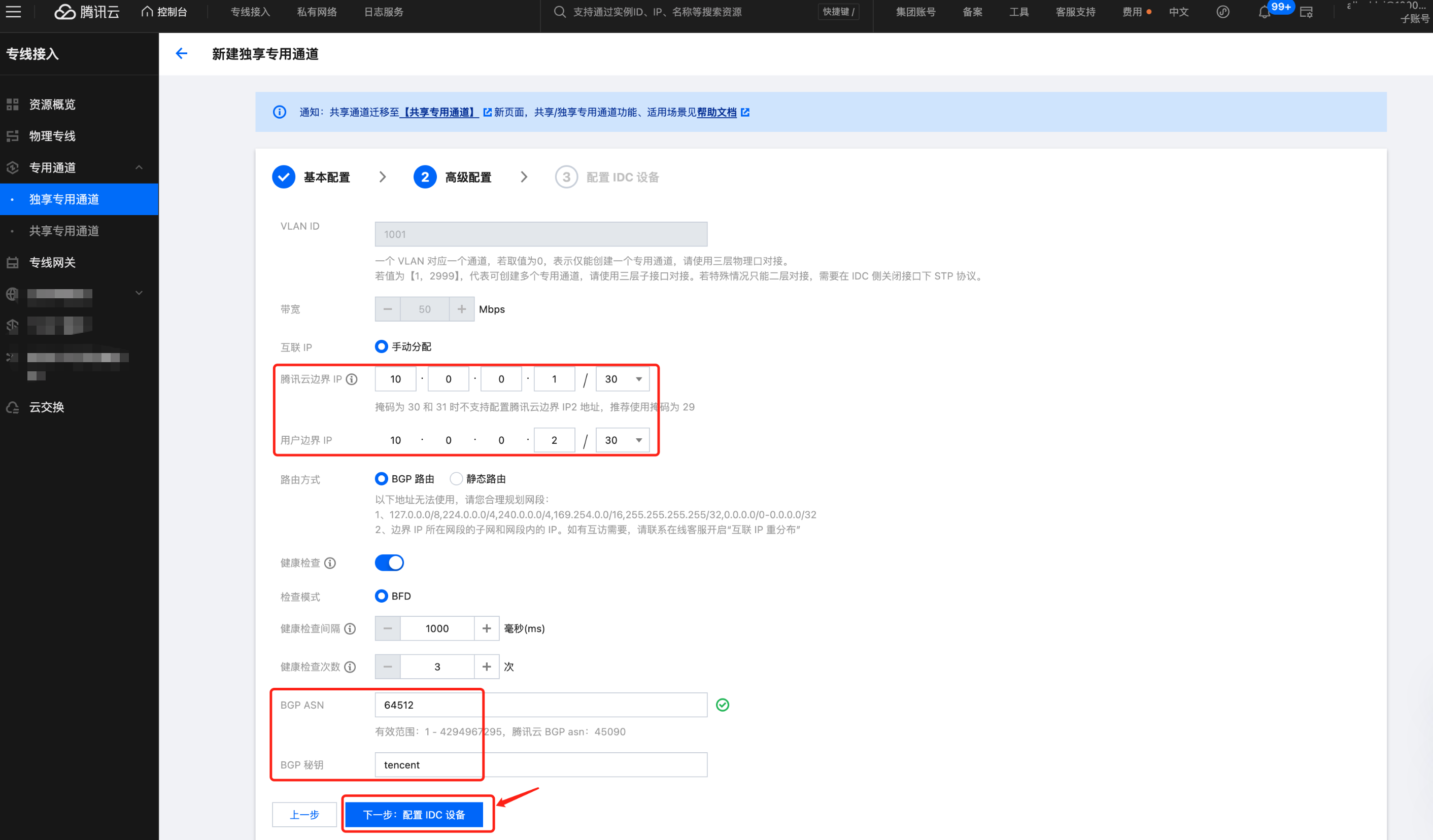 5. 填写专用通道关联的高级配置,单击下一步:配置 IDC 设备。