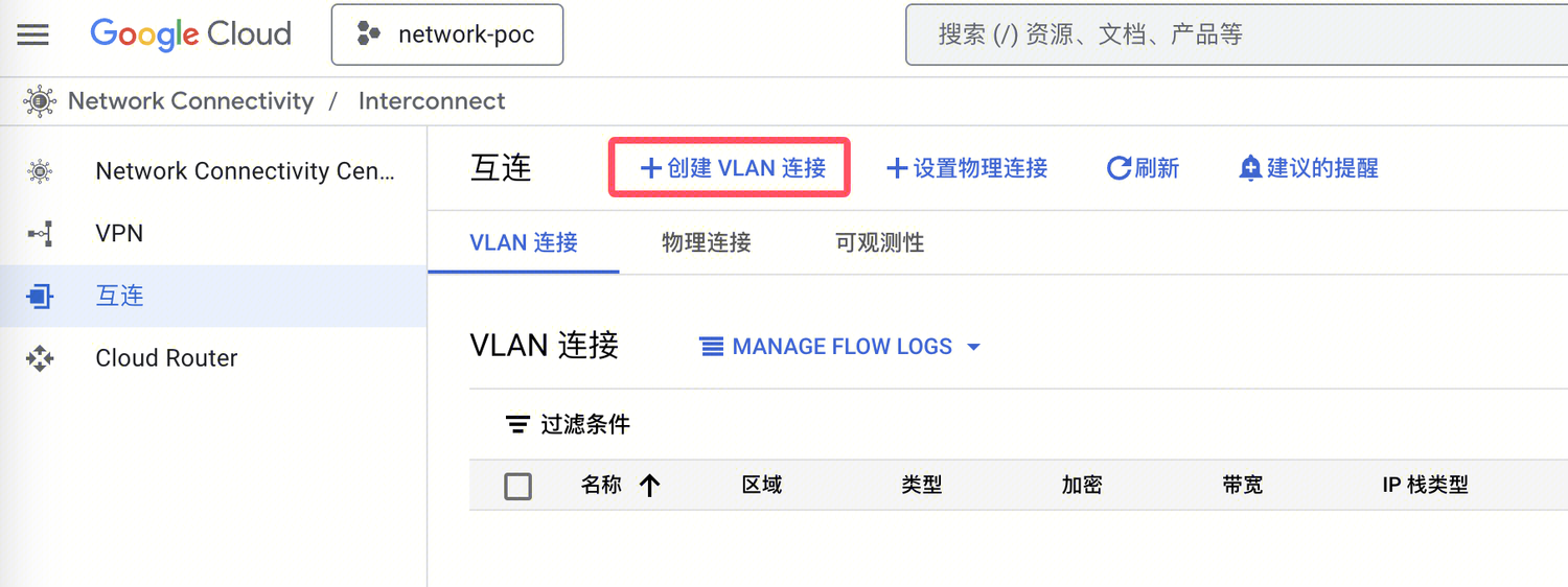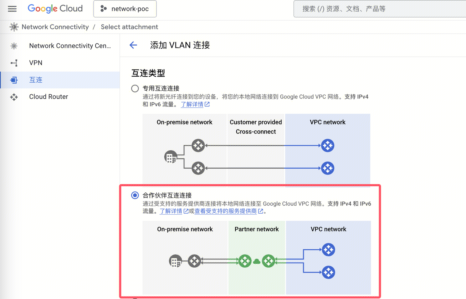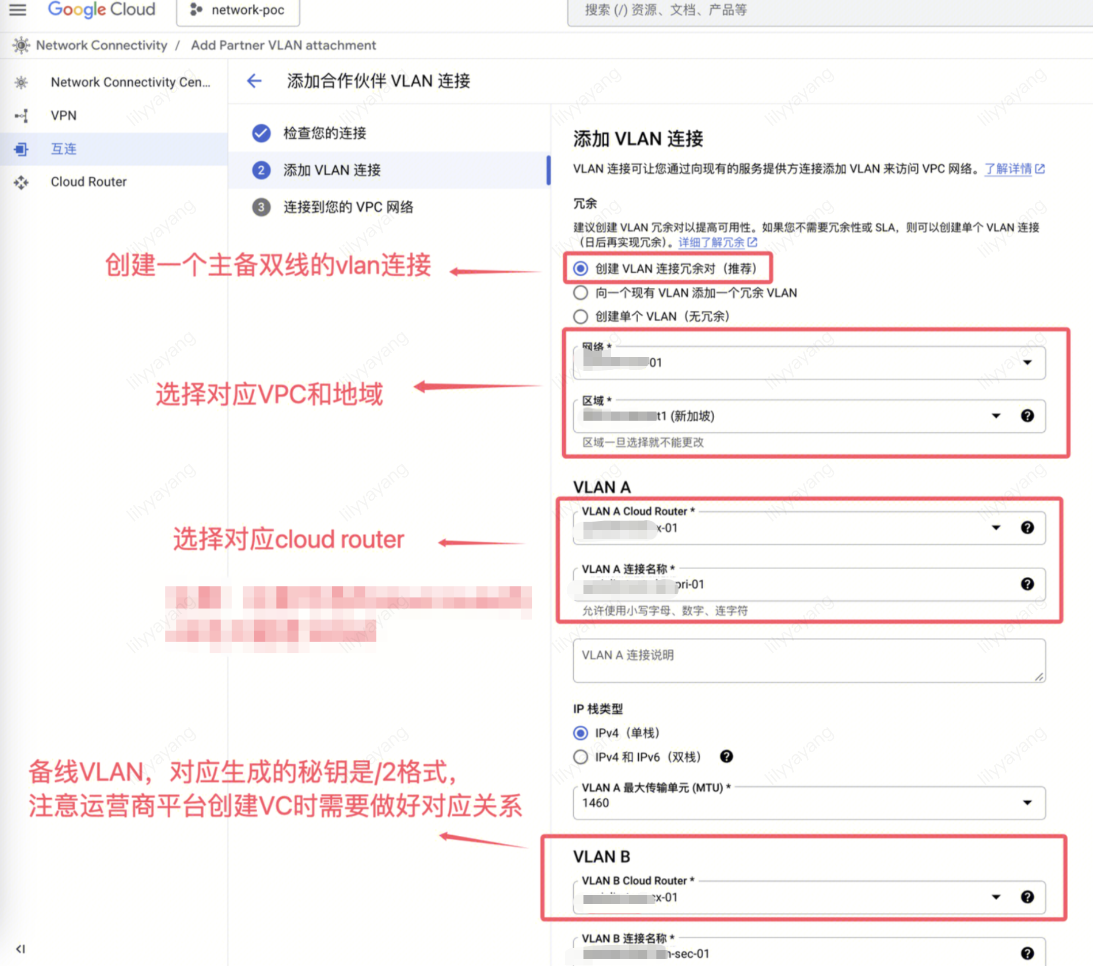 4. 配置 VLAN 连接:可按需 VPC、Cloud Router 选择和创建、IP 栈类型选择和 VLAN 配置。