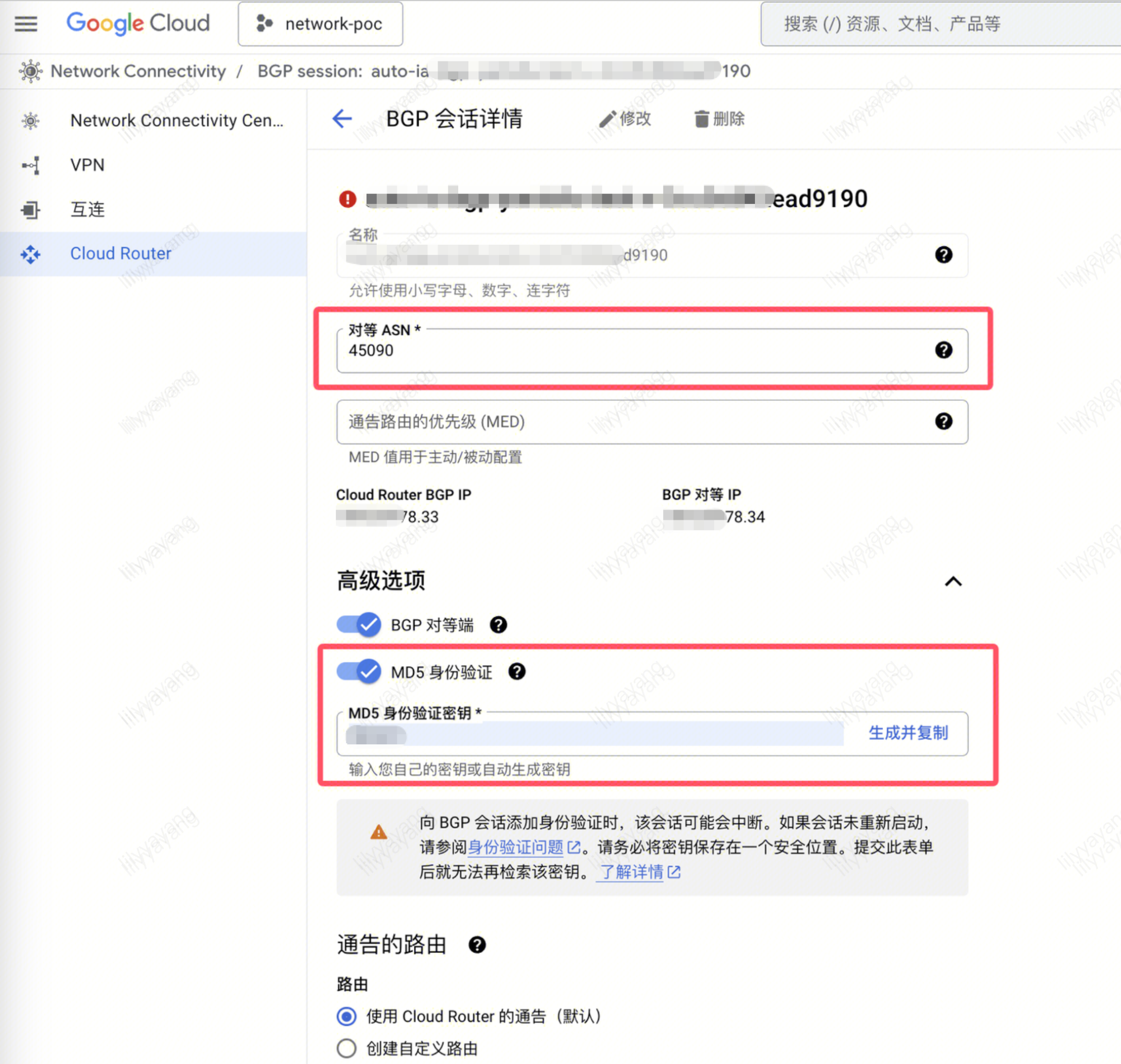8.1 进入 Cloud Router 页面,完成腾讯侧 AS 号和 BGP 协商密钥的配置。