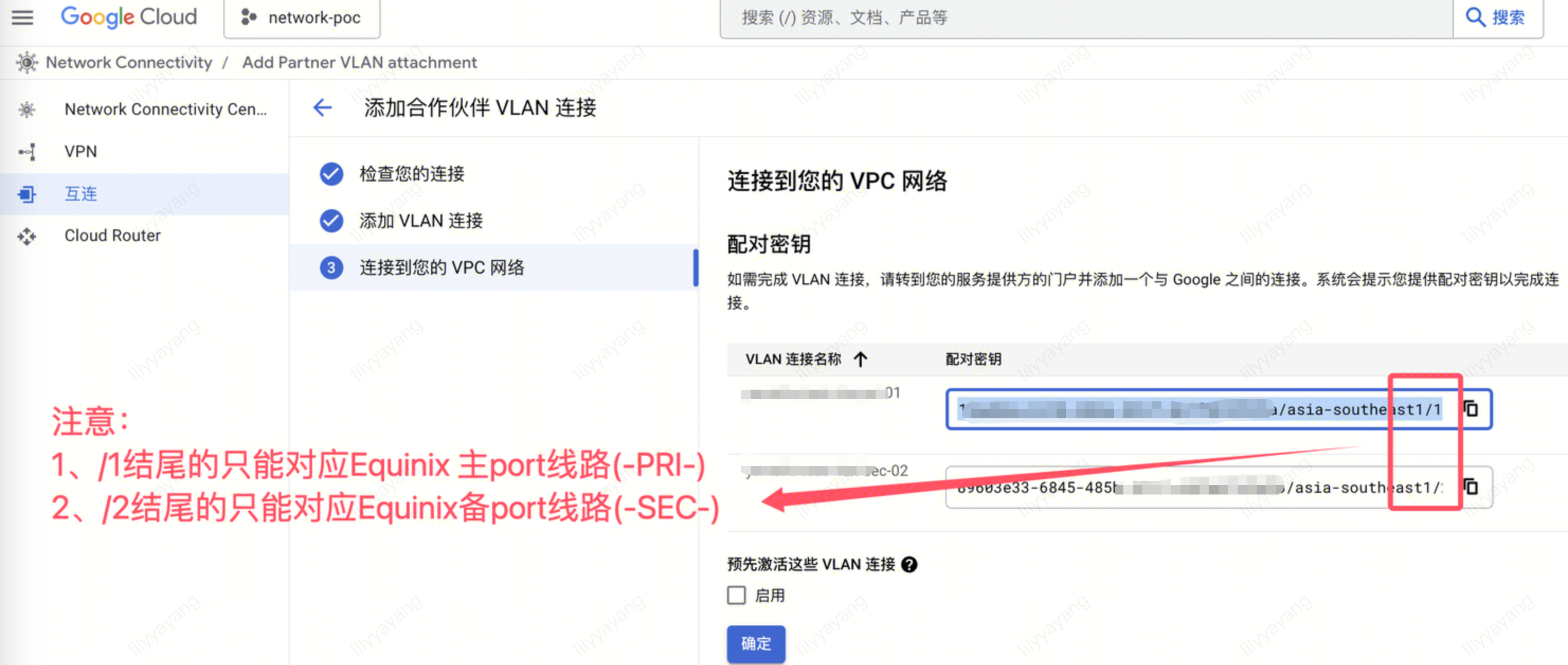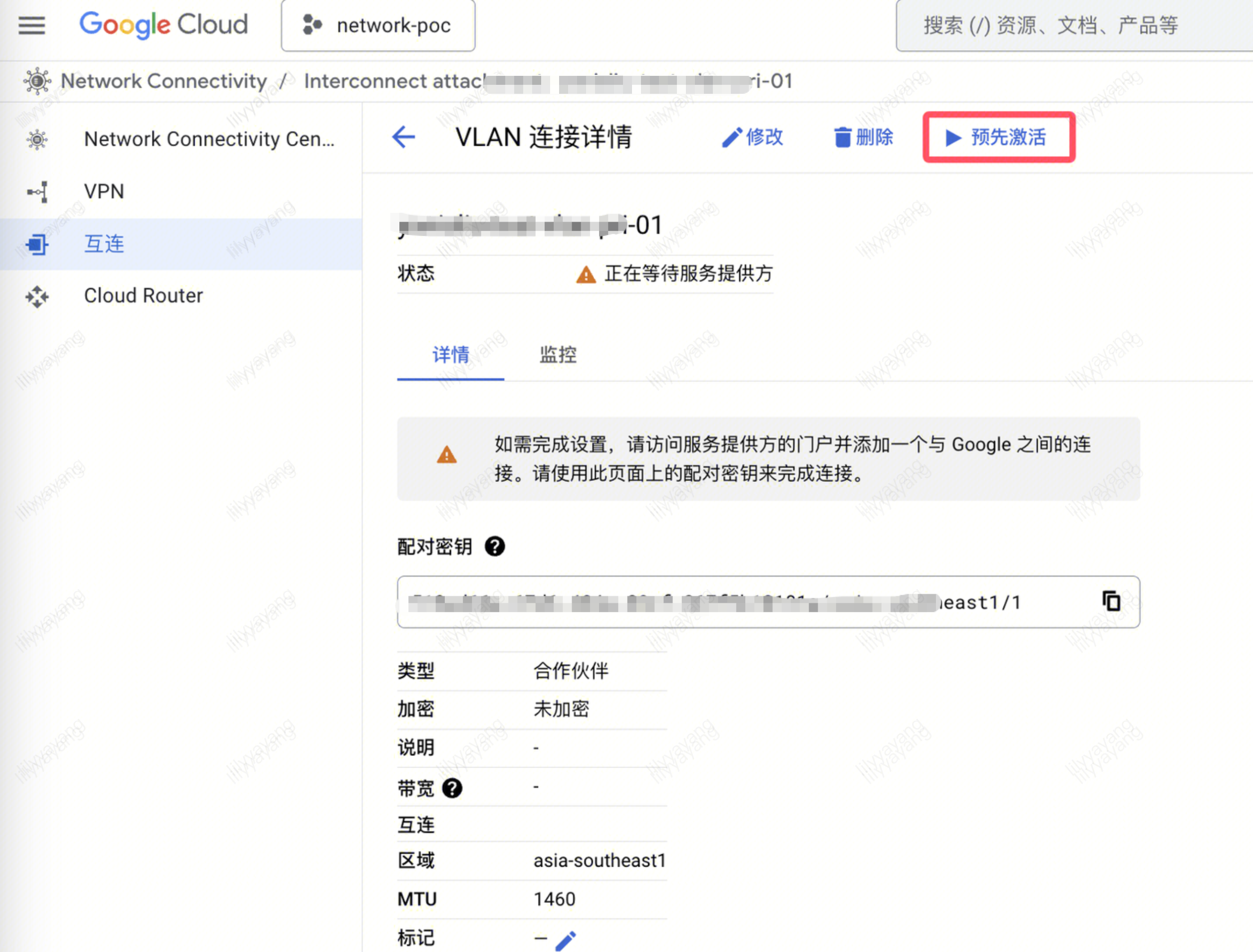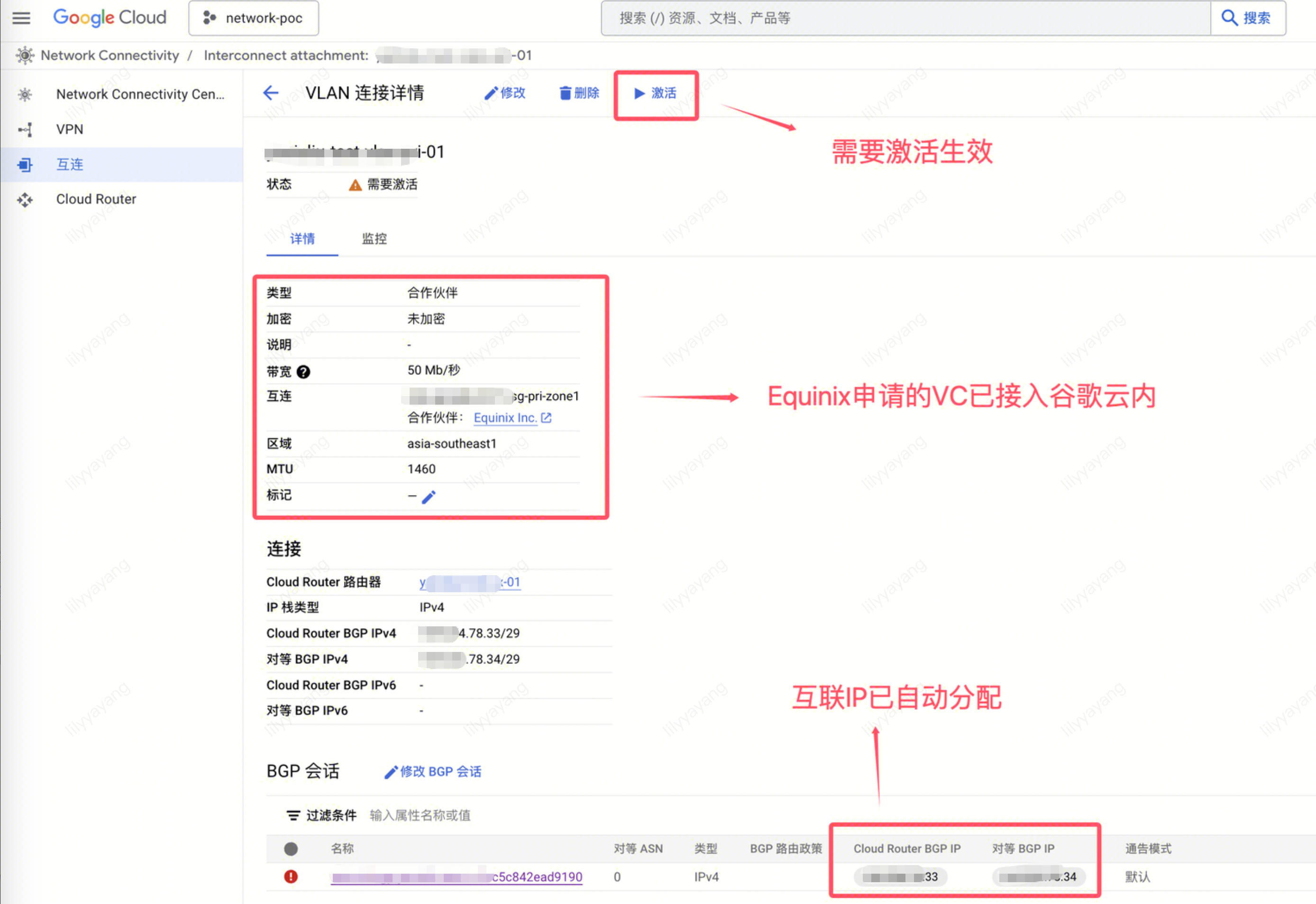 腾讯云工程师配置后,客户可以在自己谷歌云账号内看到线路接入成功,可以正式激活互联。