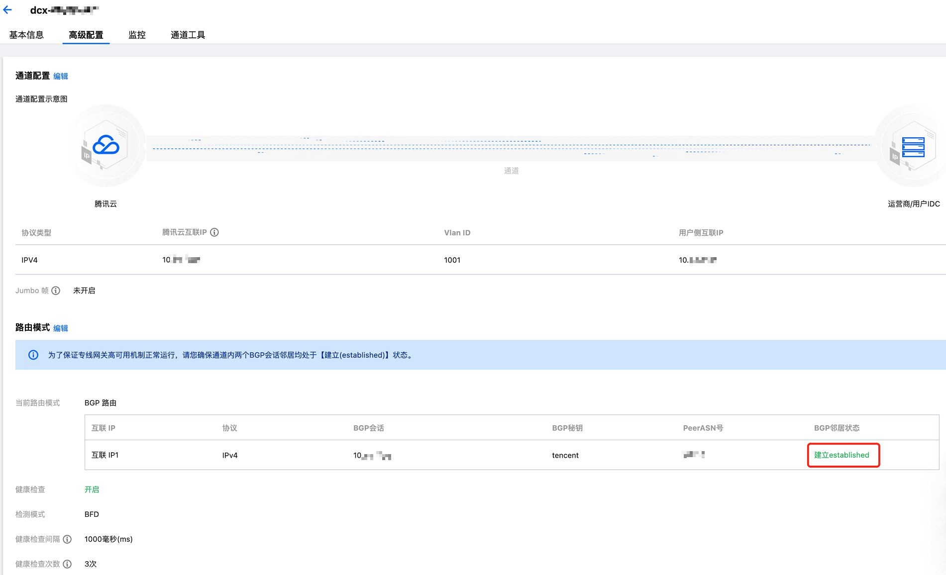 4. 在通道实例 > 高级配置页面,即可查看专用通道连接状态,BGP 邻居状态 established 表示已连接。