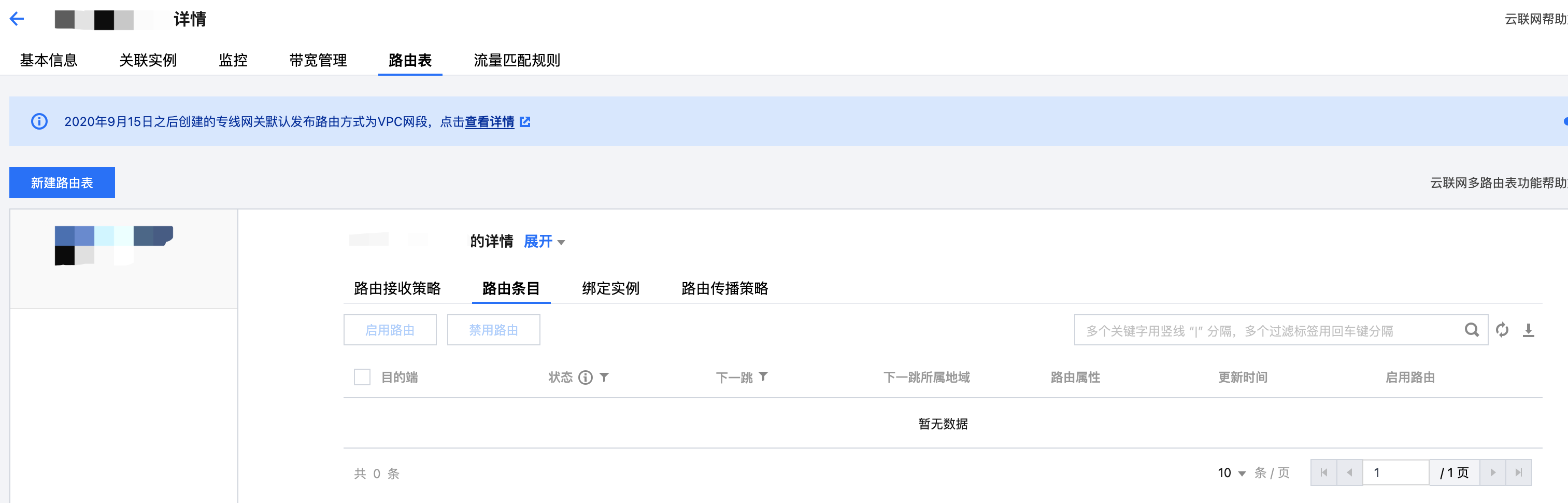 6.1 单击 ID 为 rtb-2kanpxjb 的路由表,查看 VPC 路由表策略的变化。VPC 具备自动学习云联网路由表的能力,后加入的等价路由默认不启用。VPC 往 IDC 方向的流量路径依旧选择旧的专用通道。
