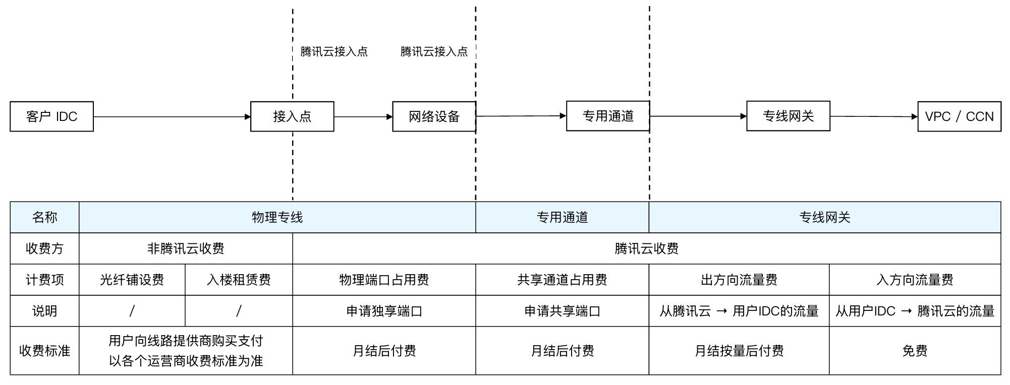 物理专线是指用户本地 IDC 与腾讯云专线接入点之间的专线部分。用户成本包括腾讯云收费项和非腾讯云收费项。