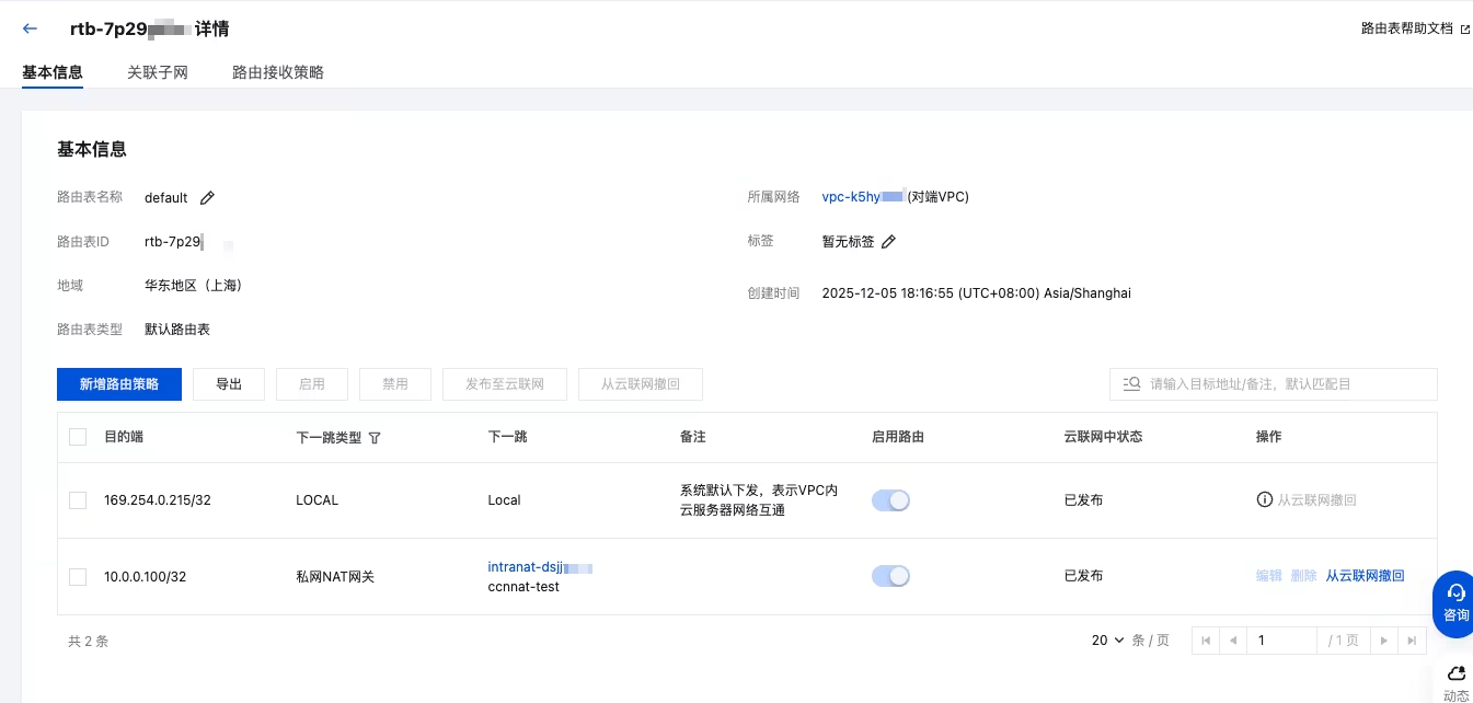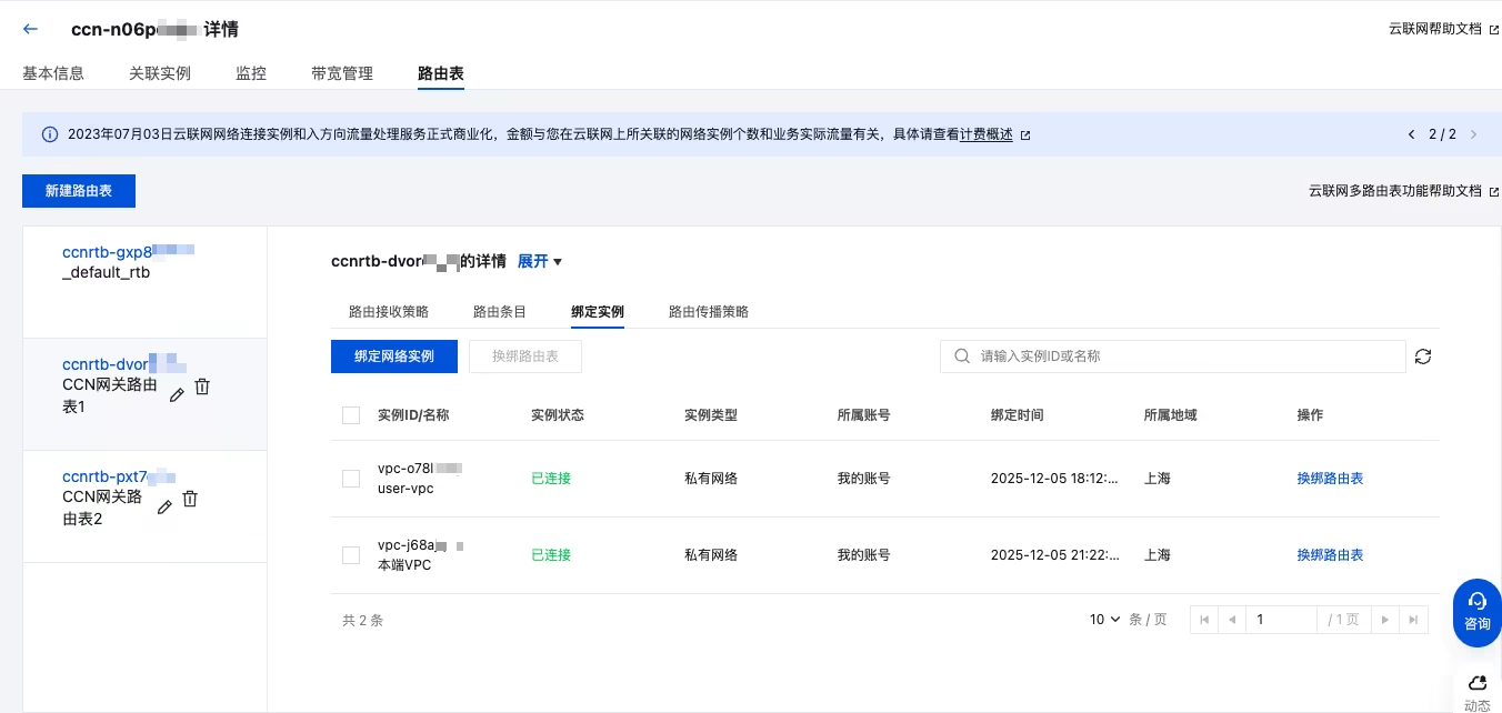3. 参考上述操作,将 NAT 实例的对端 VPC 绑定到已创建的 CCN 网关路由表 2 中。