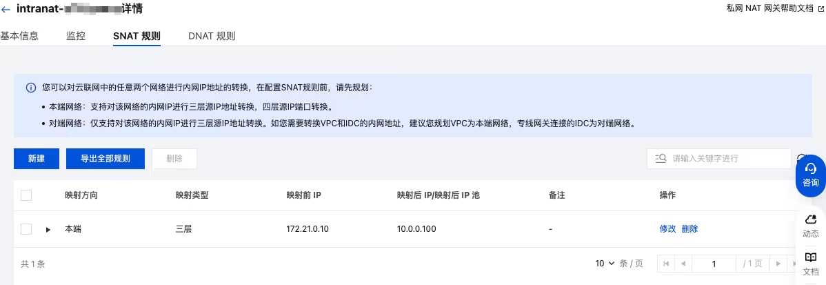 8. 在 SNAT 规则页签中,单击新建,添加本端三层 SNAT 规则,映射前 IP 为本端网络即业务 VPC 的内网 IP 地址(