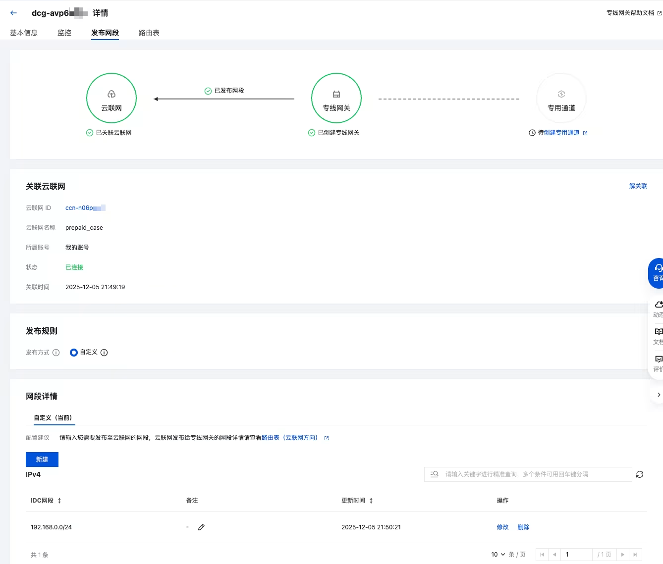 2. 登录 专线网关控制台,单击已创建的专线网关实例 ID,在专线网关实例详情页,单击发布网段页签,单击网段详情模块中的新建,以手动新增方式为专线网关发布自定义 IDC 网段。