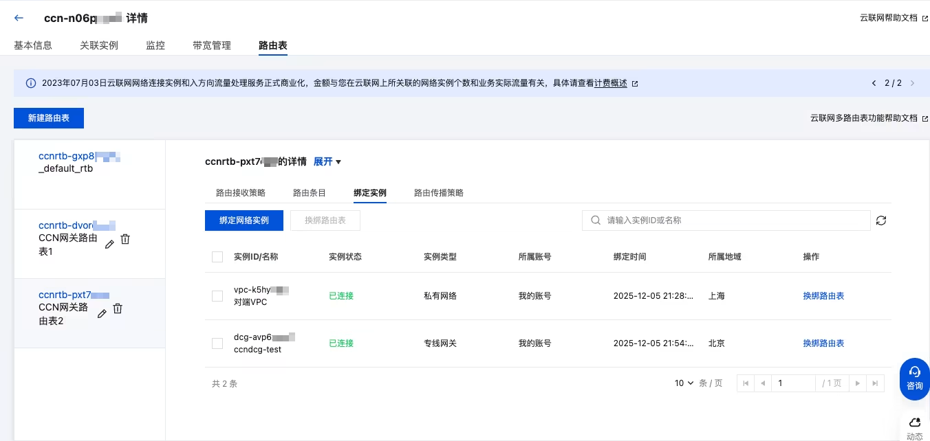 3. 在 云联网控制台 找到上述已创建的 CCN 实例,单击路由表页签,选择上述已创建的 CCN 网关路由表 2,在绑定实例页签单击绑定网络实例,将专线网关绑定到 CCN 网关路由表 2 中。