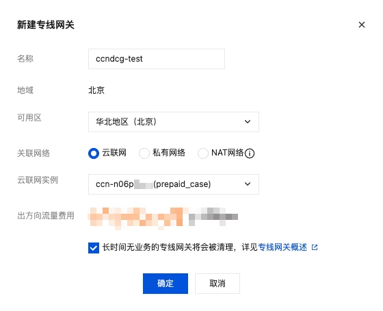 1. 登录 专线网关控制台,选择北京地域和私有网络后,单击新建。输入名称并选择可用区,关联上述已创建的云联网实例,单击确定,完成云联网型专线网关的创建。