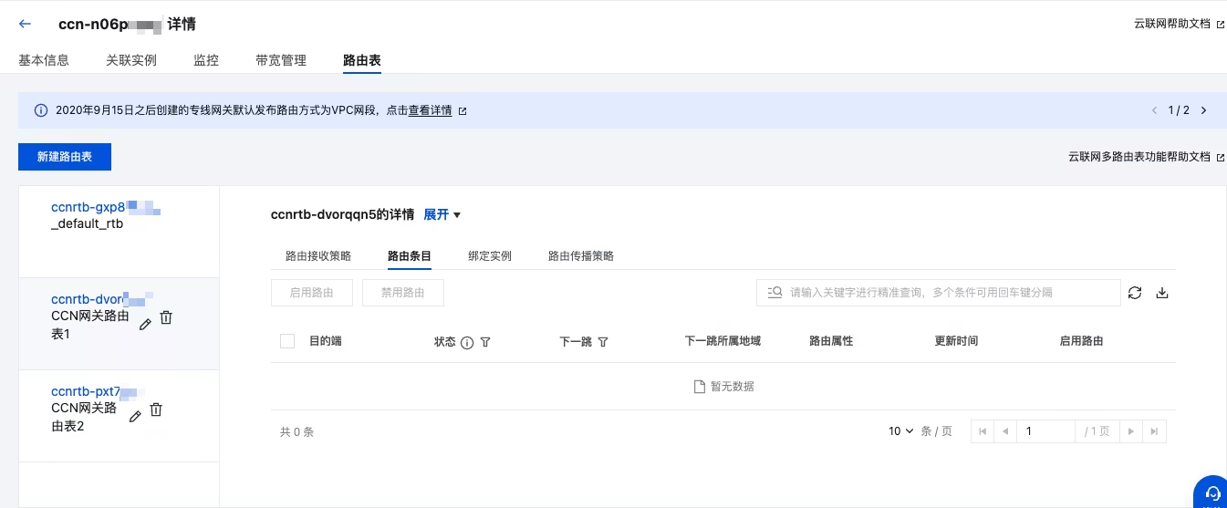 2. 在云联网实例页面,单击上述步骤中创建好的云联网 ID,在云联网实例详情页,单击路由表页签,在路由表页签单击新建路由表,创建两个路由表,即 CCN 网关路由表1和 CCN 网关路由表2。