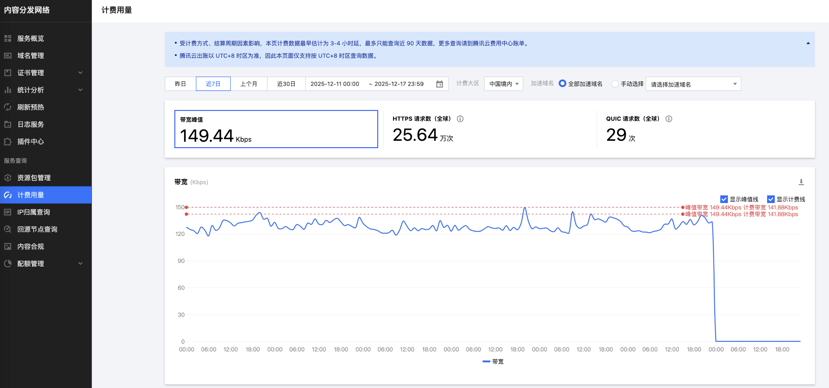 计费用量提供近90天计费维度的用量数据查询,可查询计费维度的流量、带宽以及 HTTPS、QUIC 请求数数据。